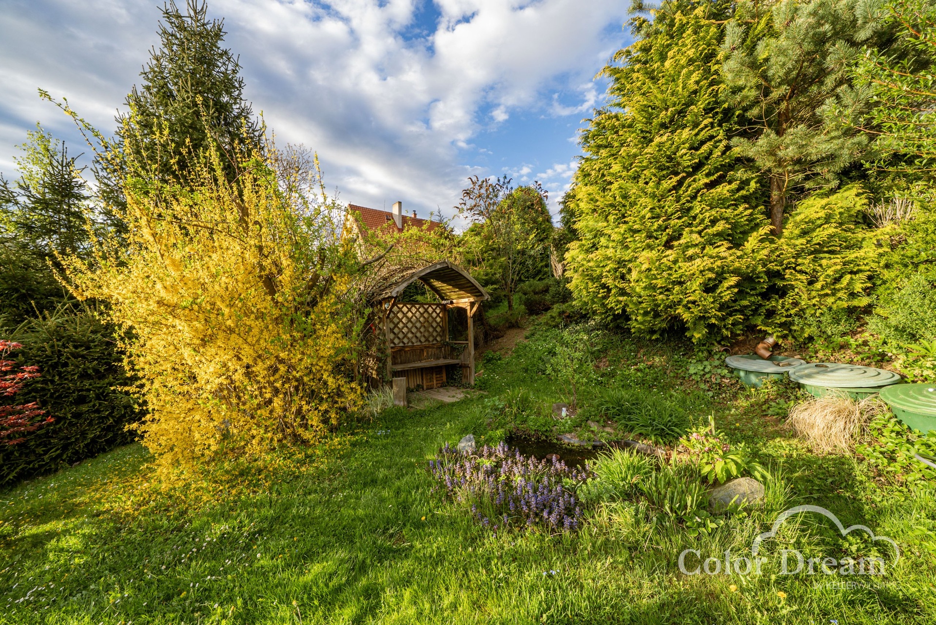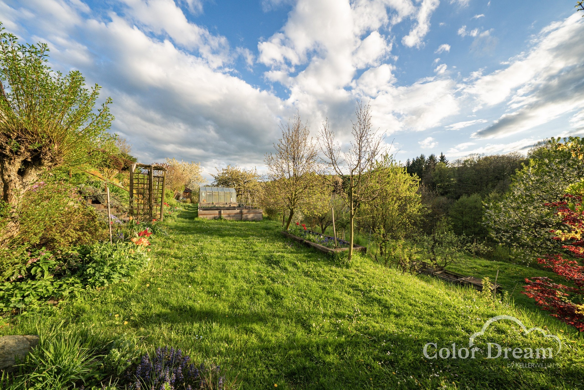 Terasovitá zahrada o rozloze téměř 2 000 m2 je klenotem celého pozemku. Naleznete zde vkusně zařízené relaxační kouty, prostor pro sezení, zeleninové či bylinné záhony, skleník, ale také krytý bazén. Snadno sem umístíte trampolínu. Je jen na vás, zda upřednostníte spíše divočejší část zahrady, dáte si oběd na terase nebo se ponoříte do zahradničení. Zahrada přirozeně přechází v krajinu, což ji opticky zvětšuje a vám dává pocit svobody a volnosti. Můžete z ní pozorovat různé druhy ptáků a zvěře.