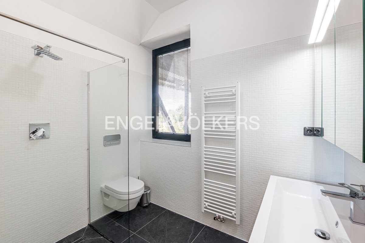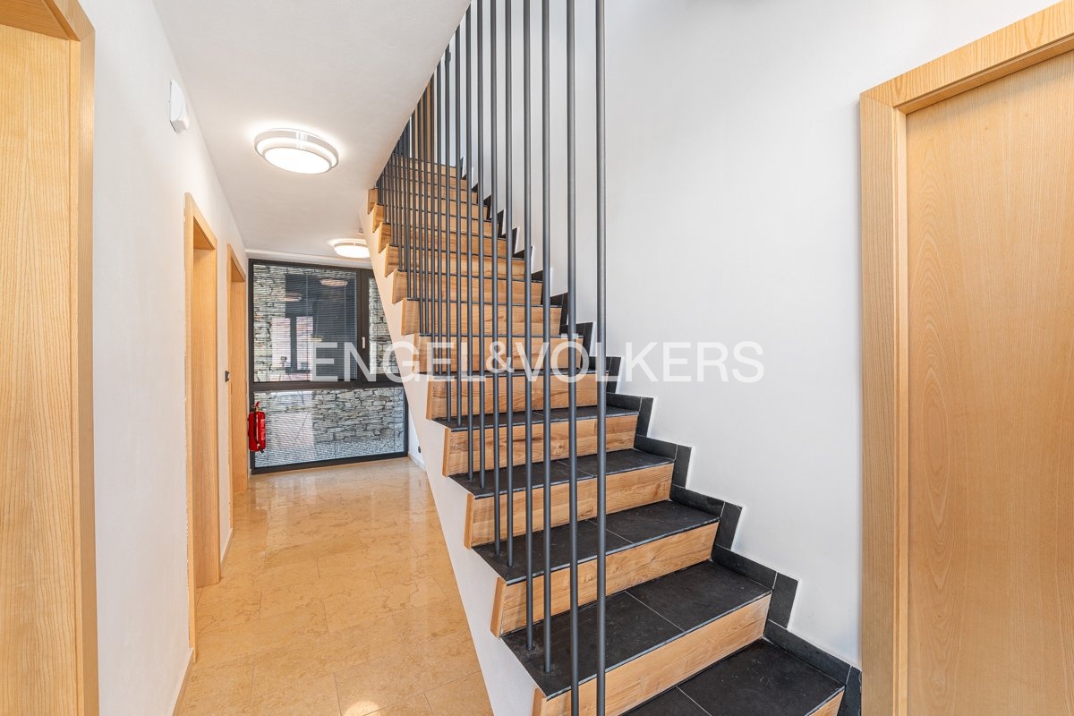 Dům je kompletně zařízen kvalitním nábytkem a proveden ve velmi vysokém standardu: podlahy z jasanu a přírodní břidlice, hliníková okna s trojskly, předokenní žaluzie, klimatizace, tepelné čerpadlo, teplovzdušný krb, sanita Villeroy & Boch a kuchyňské spotřebiče Miele. Nájemníkům budou k dispozici parkovací stání na pozemku.
