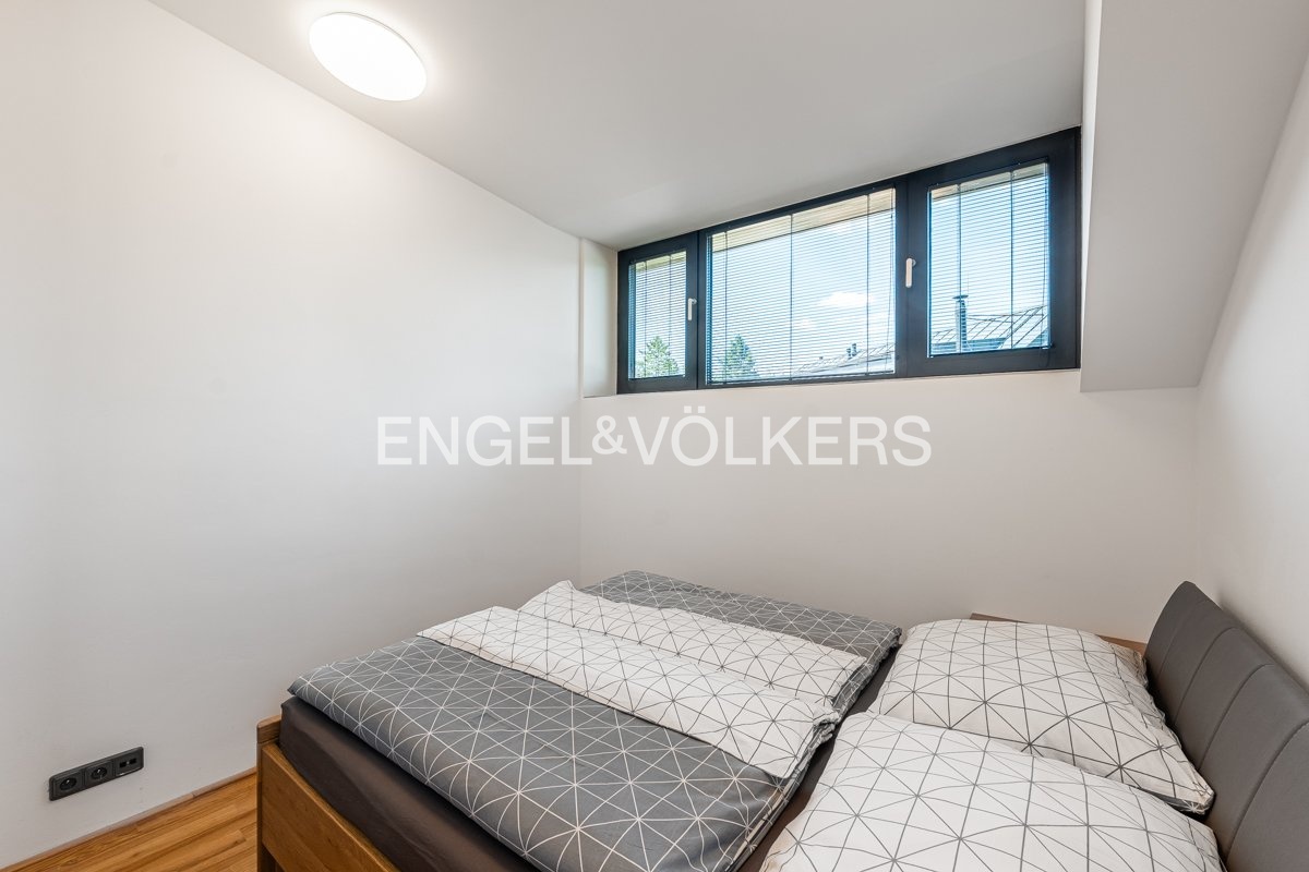 Dům je kompletně zařízen kvalitním nábytkem a proveden ve velmi vysokém standardu: podlahy z jasanu a přírodní břidlice, hliníková okna s trojskly, předokenní žaluzie, klimatizace, tepelné čerpadlo, teplovzdušný krb, sanita Villeroy & Boch a kuchyňské spotřebiče Miele. Nájemníkům budou k dispozici parkovací stání na pozemku.