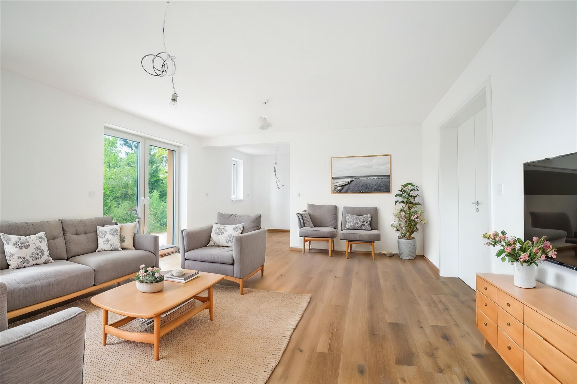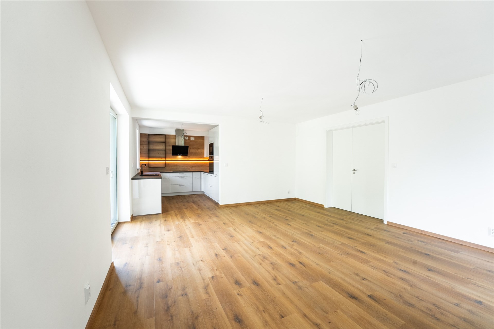 Prostorný obývací pokoj s velkou moderní kuchyňskou linkou a přímým vstupem na terasu, která obklopuje téměř celý dům. Prezentujeme kuchyni z domu C a dům C, který je již pronajatý. Aktuální dům B a kuchyně bude inzerována po její instalaci začátkem prosince 2025. Domy jsou postavené ve stejném standardu.