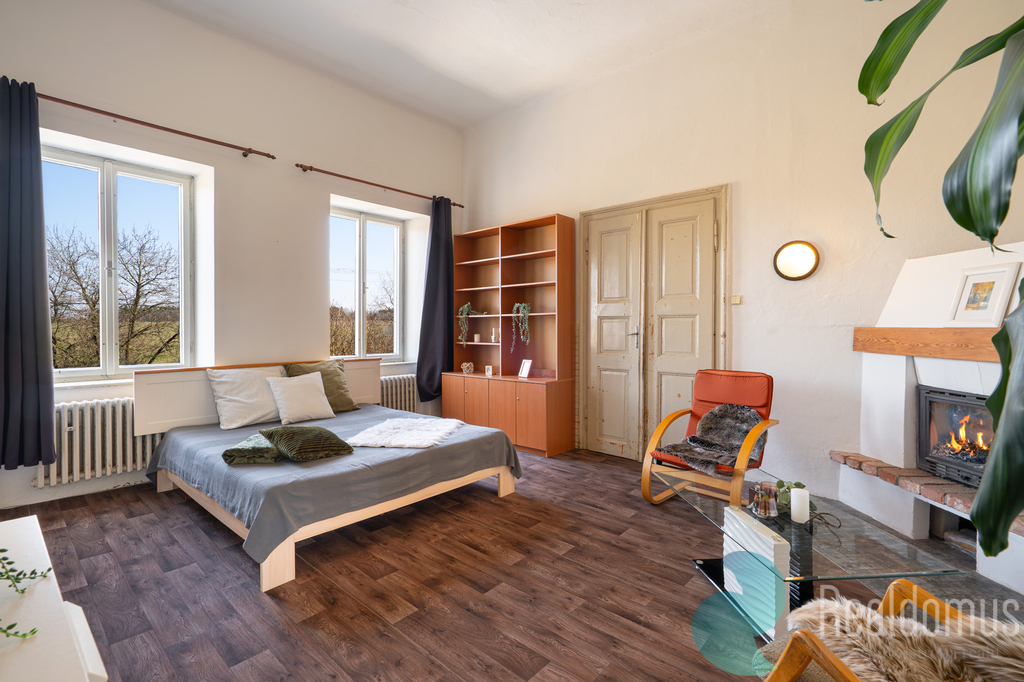 V 1. patře je situován prostorný byt o dispozici 6+kk a výměře 167 m², který prošel rekonstrukcí v roce 2023. Interiér zaujme vysokými stropy, které dávají prostoru vzdušnost a otevírají možnosti pro další architektonické úpravy. Dominantou jsou renovované dřevěné podlahy, opravené stěny a dva krby, přičemž komín je k dispozici téměř v každé místnosti – ideální kombinace atmosféry a funkčnosti. Elektřina je ve většině místností v mědi, rozvody vody jsou v plastu.