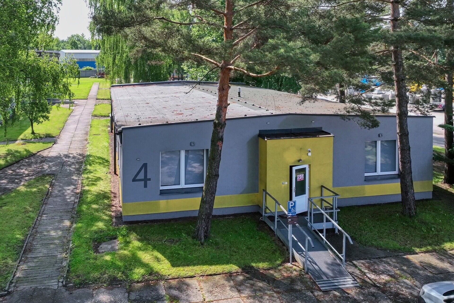 Přízemní zděná budova s mírně sedlovou střechou po celkové revitalizaci (zateplení, nová okna, fasáda, bezbariérový přístup, …) interně označená jako B4, stojící ve střeženém a udržovaném areálu na adrese Lešetínská 317/12a, Karviná-Staré Město – v Průmyslové zóně MATYAS PARK, ve kterém mimo jiné sídlí prodejce stavebnin DEK.