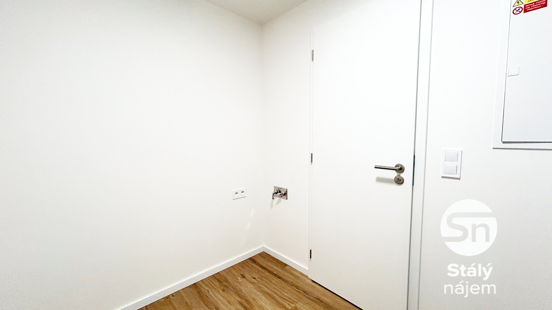 Koupelna je elegantně řešená s bidetovou sprchou, žebříkovým topením, sprchovým koutem a zrcadlovou skříňkou, obývací pokoj je propojený s moderní kuchyní vybavenou indukční deskou, horkovzdušnou troubou, myčkou, nerezovým dřezem a svítidlem pod linkou. Ložnice nabízí pohodlí se dvěma garnýžemi a záclonami, chodba má praktickou přípojku na pračku a k bytu patří prostorná terasa s dlažbou, přípojkou na vodu a nástěnným osvětlením. Bezpečnost a komfort zajišťuje domovní telefon s kamerou a nástěnná rekuperace.
