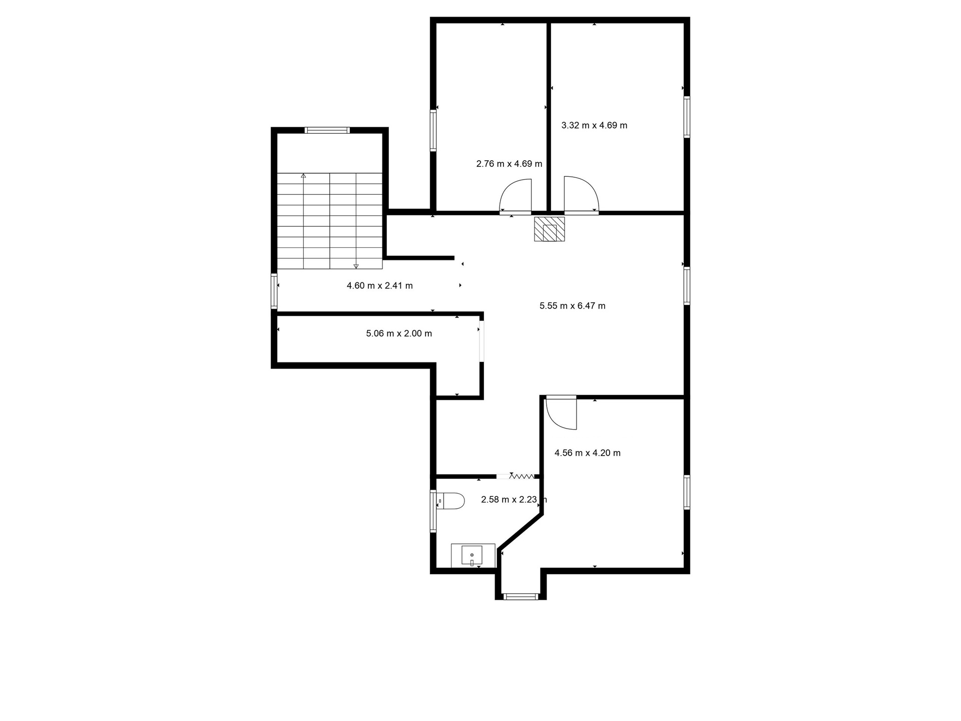 * V patře jsou umístěny 3 pokoje (ložnice a dva dětské pokoje), hala s krbem a koupelna s toaletou