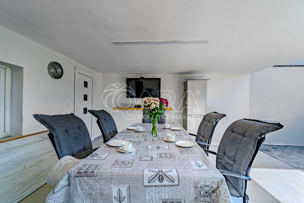 Přízemí: Ze zádveří vedou schody do suterénu a do zvýšeného přízemí. Zde se nachází prostorný obývací pokoj propojený s moderní kuchyní, velká prosluněná jídelna s nádherným a klidným výhledem do zahrady a na přilehlý les, ložnice s komorou a s přímým vstupem do koupelny vybavené sprchovým koutem, vanou a toaletou, a dále samostatná toaleta.