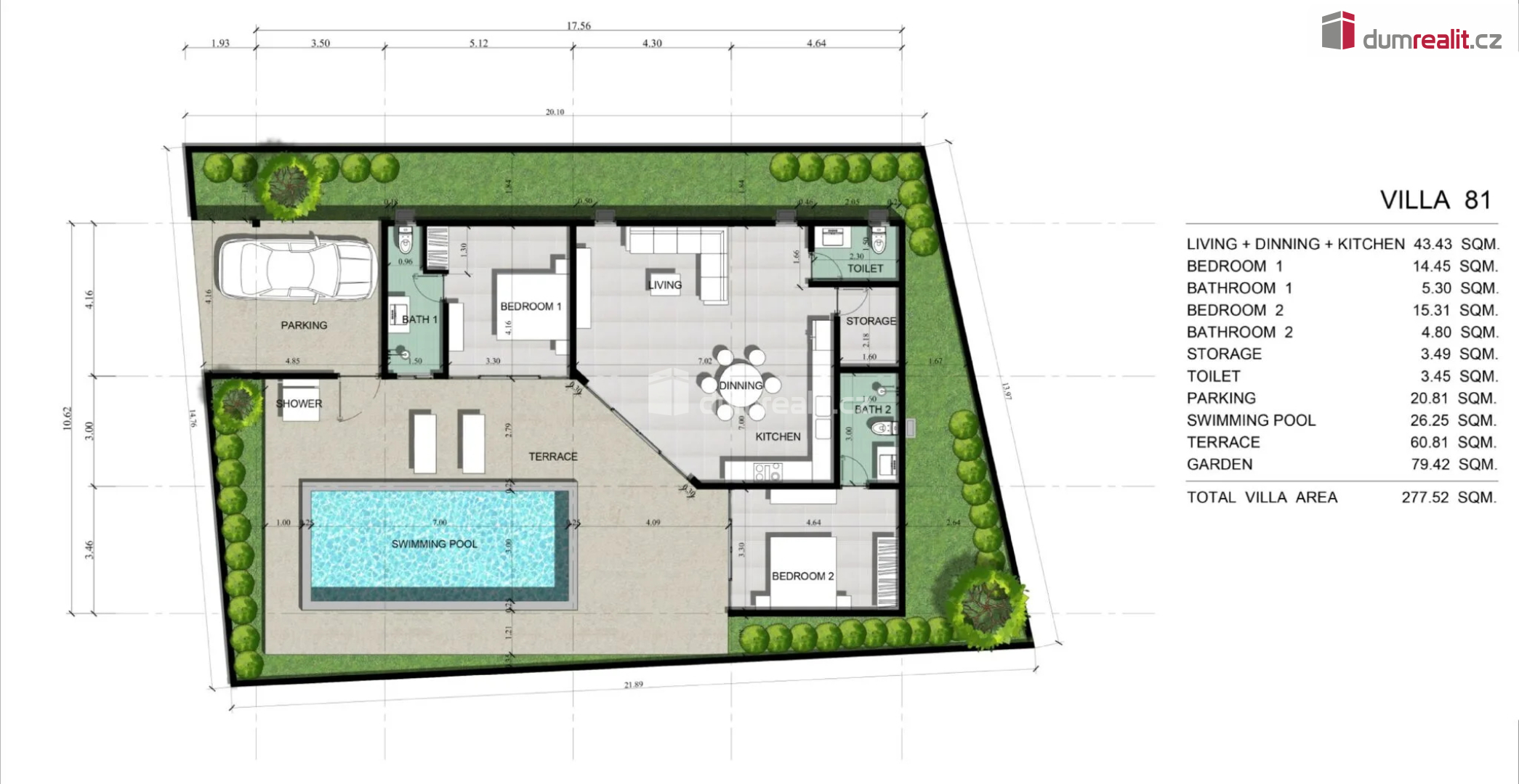 Pozemek vily o rozloze 303 m² poskytuje dostatek prostoru pro venkovní relax. Ať už se budete opalovat na tropickém slunci u soukromého bazénu nebo si dopřávat klidné chvíle uprostřed svěží zeleně, venkovní prostory vily nabízejí útočiště pro relaxaci a regeneraci.