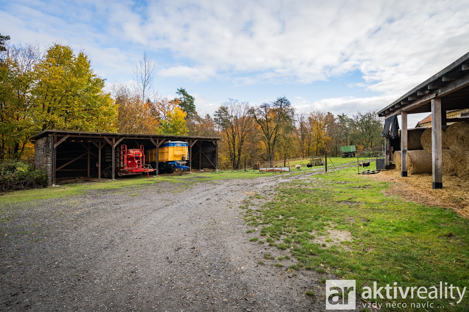 Za stodolou se nacházejí také dva polootevřené přístřešky o celkové ploše 209 m², které prakticky rozšiřují úložné a provozní možnosti areálu – ideální například pro techniku, dřevo či sezónní materiál.