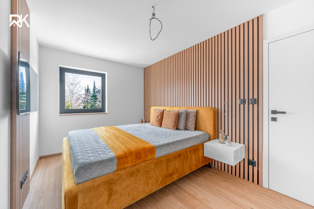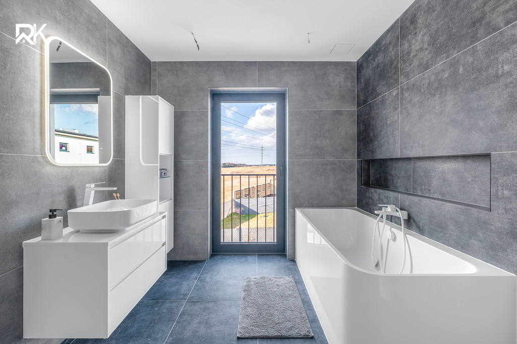 Patro (2. NP): Centrální chodba, ložnice, dětský pokoj, samostatná prádelna s pračkou a sušičkou a prostorná koupelna. Ta disponuje volně stojící vanou a velkoformátovou dlažbou (vybavení v hodnotě 250 000 Kč).
