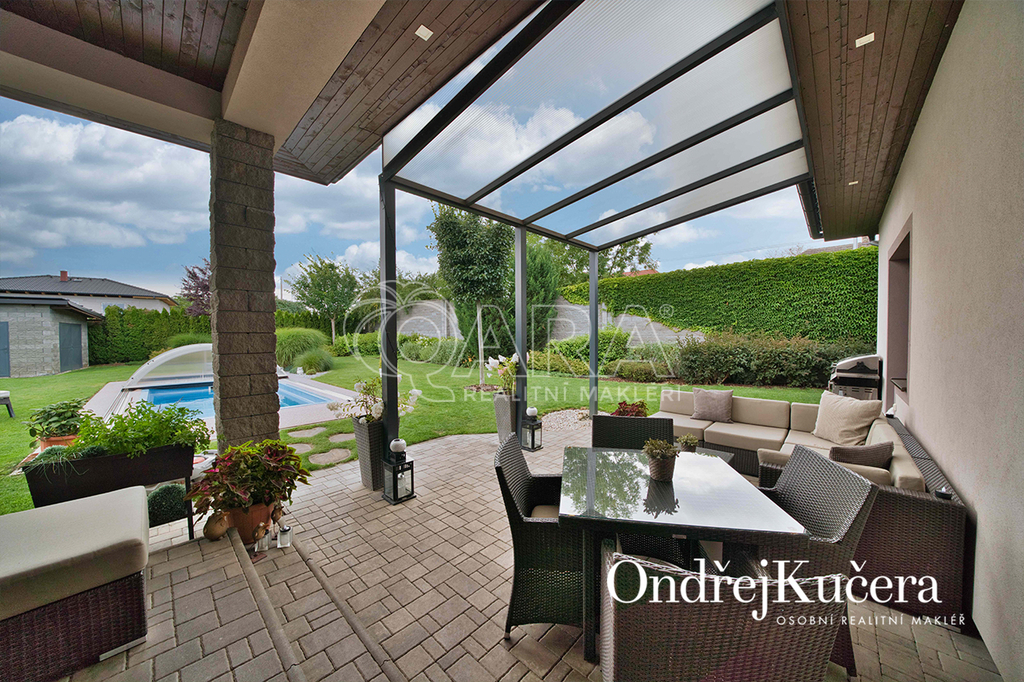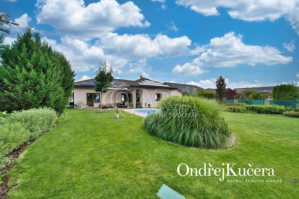 Zahrada kolem domu byla promyšleně navržena architektem, aby se během roku měnila v pestrou podívanou. Automatický zavlažovací systém napojený na vlastní vrt a retenční nádrž zajišťuje její nenáročnou údržbu. Je zde také zapuštěný keramický bazén se slanou vodou a samostatný zahradní domek s dílnou. Součástí prodeje je i automatická sekačka.