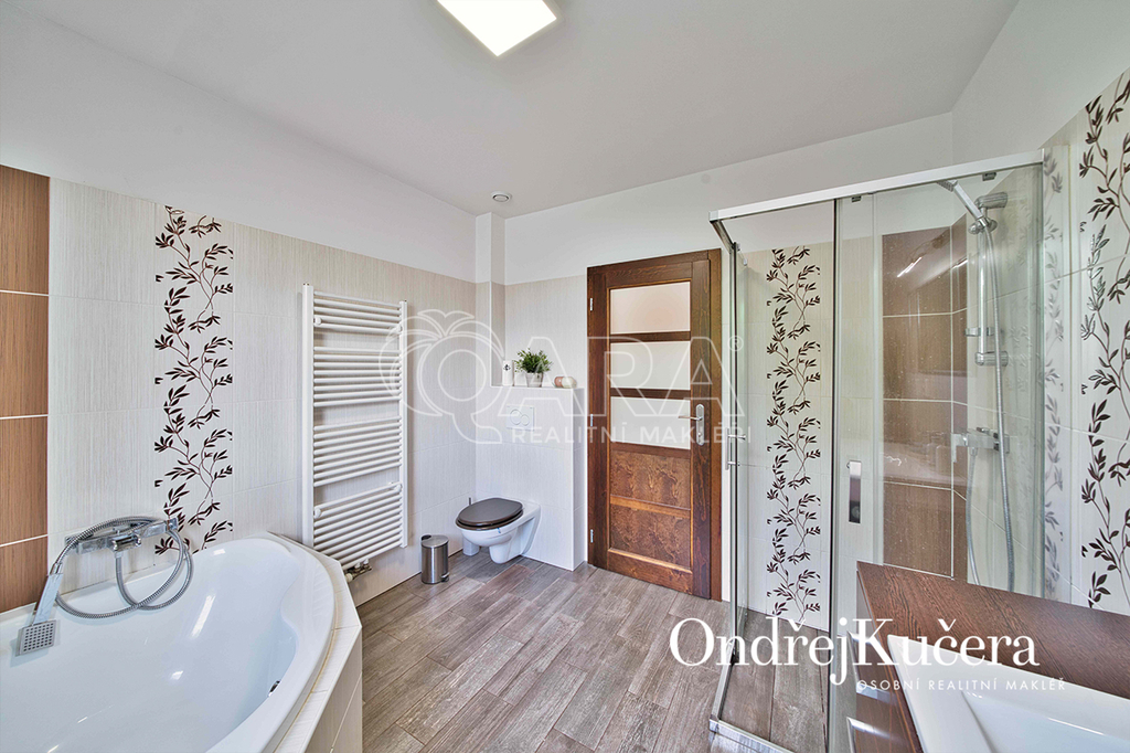 Interiér je navržen prakticky a moderně. Přes zádveří s vestavěnou skříní projdete do jídelny s kuchyní a dále do prostorného obývacího pokoje. Z centrální chodby máte přístup do dvou ložnic se vstupem na terasu. Dále do hlavní samostatné ložnice, prostorné šatny, technické místnosti, koupelny s rohovou vanou, sprchovým koutem a toaletou. Další toaleta je zvlášť. V obývacím pokoji o výměře přes 30 m2 je rodinný krb a vstup na krytou terasu. Kuchyň je od jídelní části oddělena decentním barovým pultem a je vybavena veškerými vestavěnými spotřebiči značek Bosch a Miele, včetně americké lednice. Vedle kuchyně je i samostatná spíž. Dveře a obložky jsou vyrobeny z masivu, okna mají moderní žaluzie typu den a noc, osvětlení je řešeno dekorativními LED prvky.