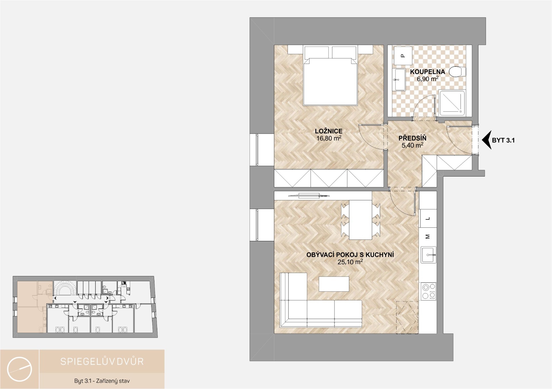Bytová jednotka se nachází v 3.NP historického objektu v centru města. Spiegelův dvůr tvoří soubor staveb procházející obnovou. Bytová jednotka se nachází v čelní budově, kde je v přízemí tradiční česká restaurace. Dvůr je pojmenován po rodině podnikatele Spiegela, jehož pravnučkou byla Madeleine Albrightová.