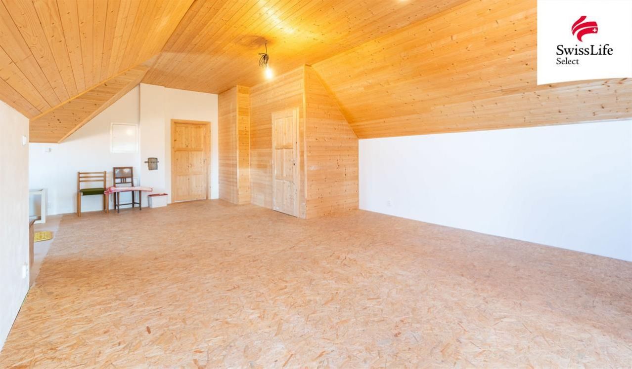 První patro je nově vybudované klasickou zděnou technologií z moderních pálených cihel zn. Heluz, které se pyšní dobrou akumulací tepla, tepelně-izolačními parametry a dlouhou životností. Je zde příprava na druhou kuchyň, dvě střešní okna, francouzské dveře a na podlahách OSB desky a litý barvený beton s podlahovým vytápěním. Zatím je tento velký prostor nerozdělený, umístění finálních příček čeká na potřeby svého nového majitele. Taktéž zateplení domu a finální fasáda byly ponechány na výběr a rozhodnutí kupujícímu.