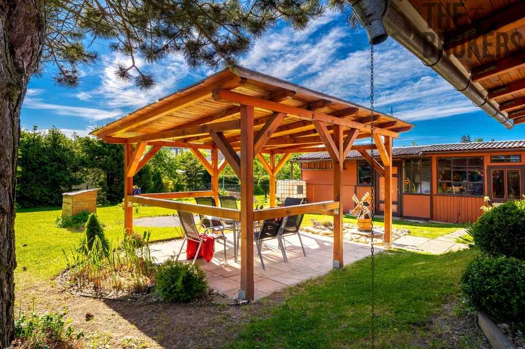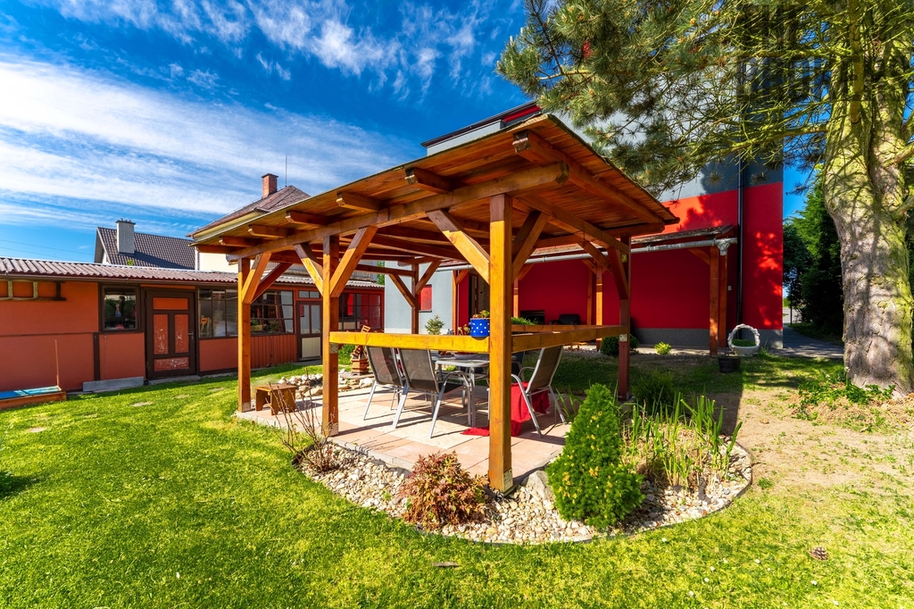 K domu náleží krásná, udržovaná zahrada o velikosti 819 m², kde najdete dostatek prostoru pro odpočinek, hry s dětmi i rodinné grilování. Pergola i zahradní domek poskytují praktické zázemí pro relax i práci.