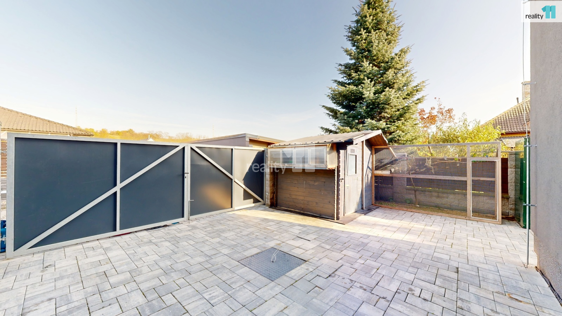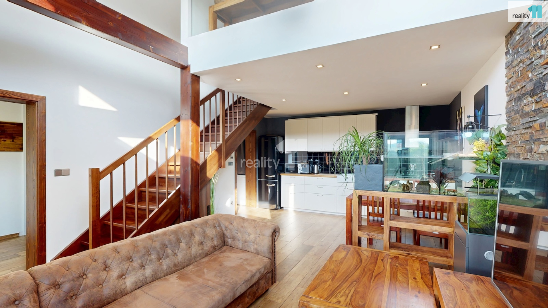 Dvě ložnice a hlavní koupelna s vanou, nás čekají v patře, kam se dostaneme po dřevěných schodech. Pokud by nový majitel pořebova potřeboval, dá se přistavět ještě pokoj nad střechu garáže, při jejíž výstavbě se s touto variantou počítalo. Dům je plný světla, i díky jedné stěně, která je kompletně prosklená. Jsou zde kvalitní podlahy, obklady i sanitární technika, podlahové elektrické vytápění, klimatizační jednotky. Majitelé nad zařízením důsledně přemýšleli, aby v domě byl dostatek úložných prostor a dál působil vzdušně a pohodlně, takže jsou využity i prostory pod schodištěm a další zákoutí. Zimní zahrada se vstupem na terasu, má přípravu i pro případné umístění krbových kamen. Terasa slouží zejména pro relaxaci, grilování, posezení a rozděluje zahradu na přední a zadní část. Přední část je travnatá s automatickou závlahou, s několika okrasnými keři a slouží zejména pro děti. Zadní část je vydlážděná, vhodná pro parkování aut. Je zde také menší technický domek, i když v garáži je opravdu dostatek prostoru i pro vášnivého kutila.