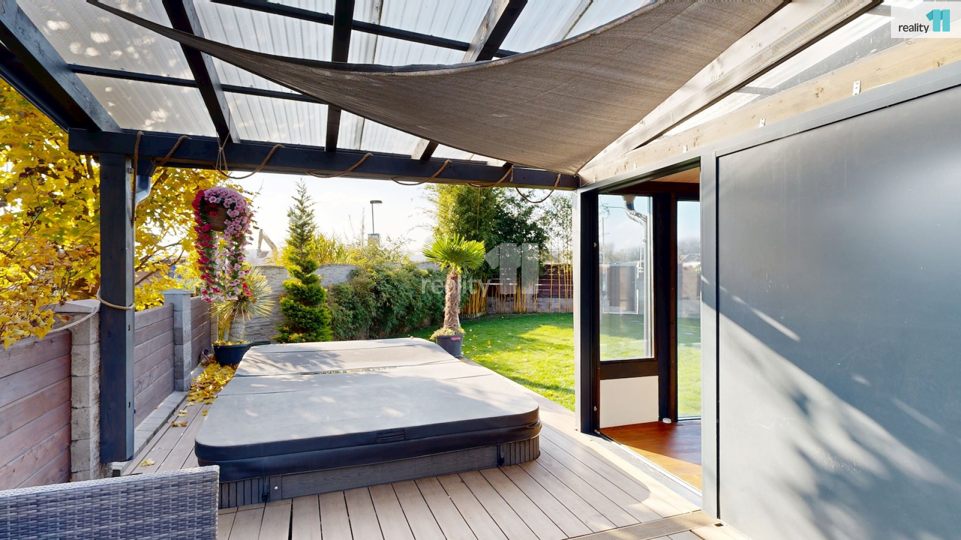 Dům je postaven z moderních materiálů, umístěný do příjemné zahrady s velkou terasou, prostornou garáží a vydlážděnou částí pro 2 - 3 auta, technickým domkem a venkovní vířivku.