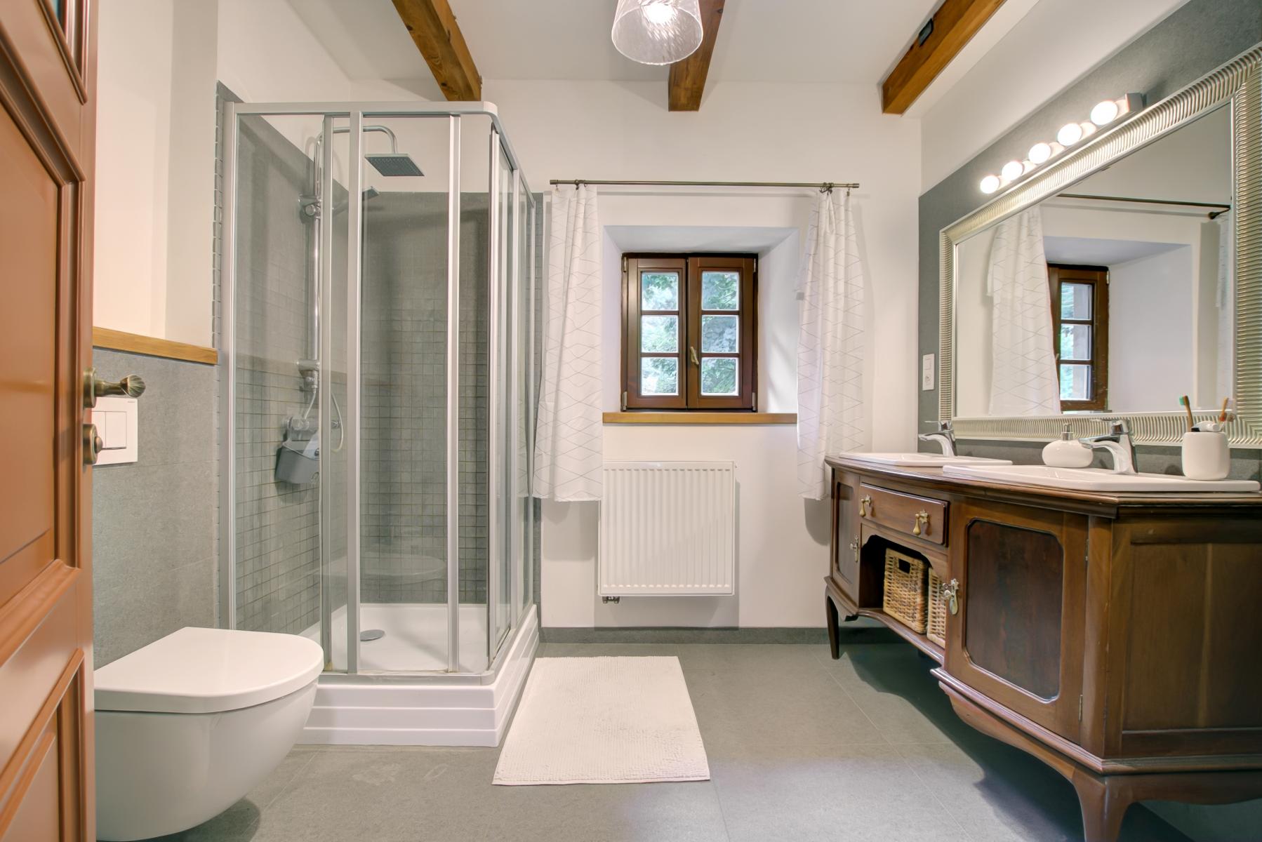K dispozici jsou v současnosti celkem 3 ložnice, půda, světlý obývací prostor s kuchyňským koutem, moderní koupelna s WC, velký prostor v přízemí s přípravou pro kuchyň, 3x WC, technické zázemí a dostatek úložných prostor. Interiér doplňují dřevěné trámy, stylové dveře a dostatek přirozeného světla díky střešním i klasickým oknům.