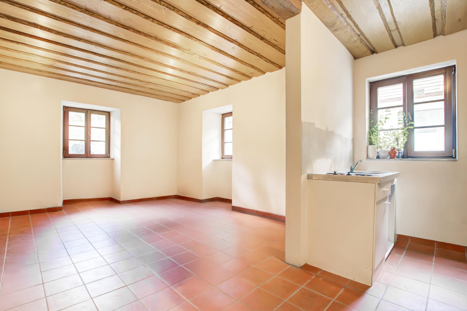 Velkého prostoru v přízemí lze využít jako kuchyň pro restauraci, kavárnu či společenskou místnost. Výhodou je technické zázemí a 2x samostatné WC.