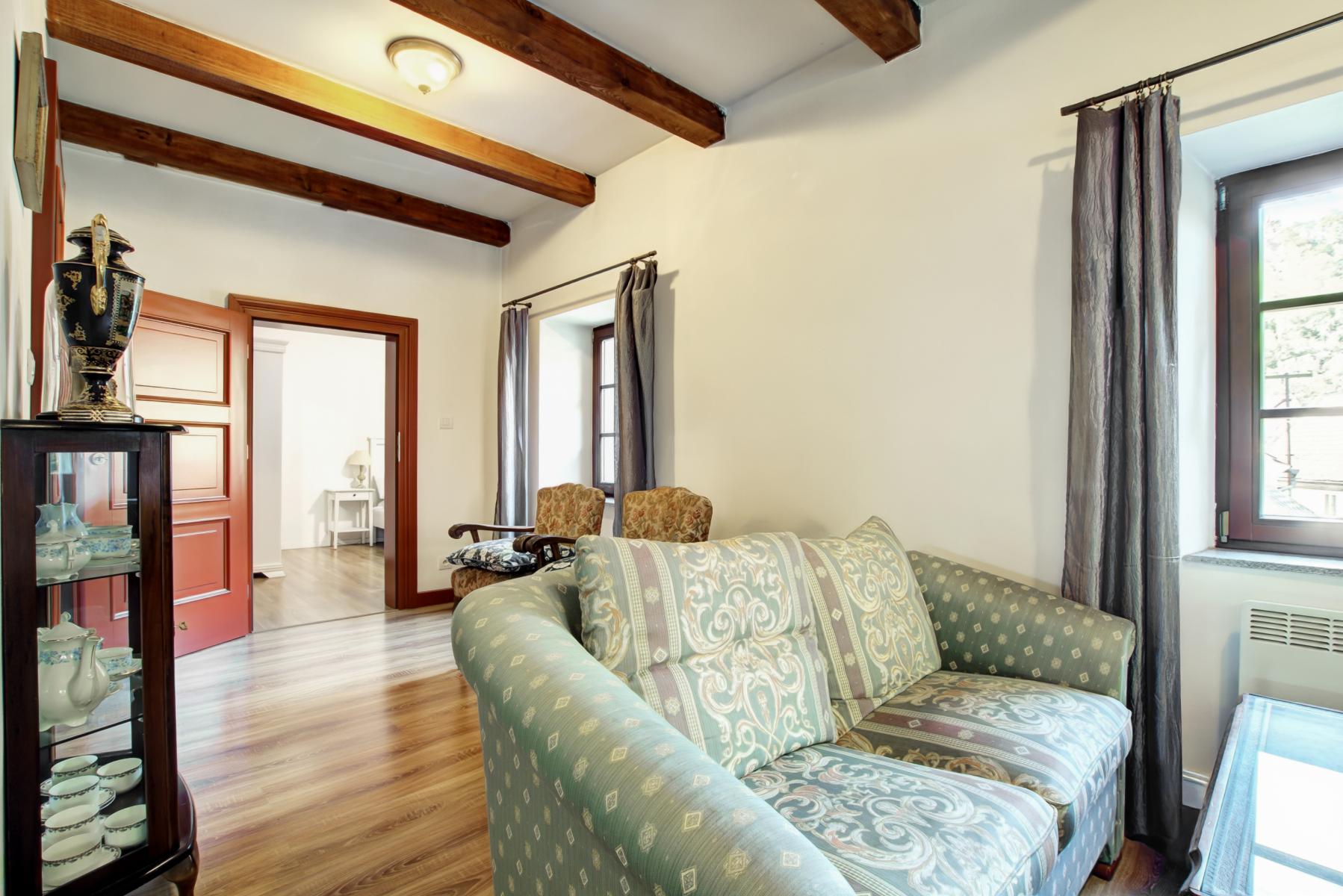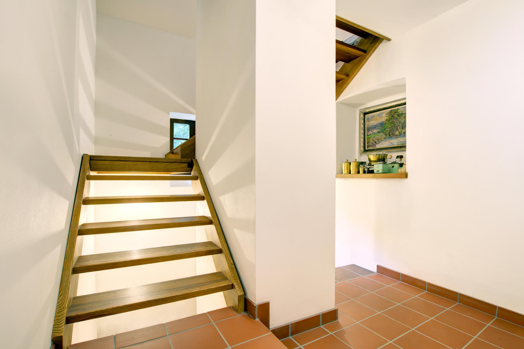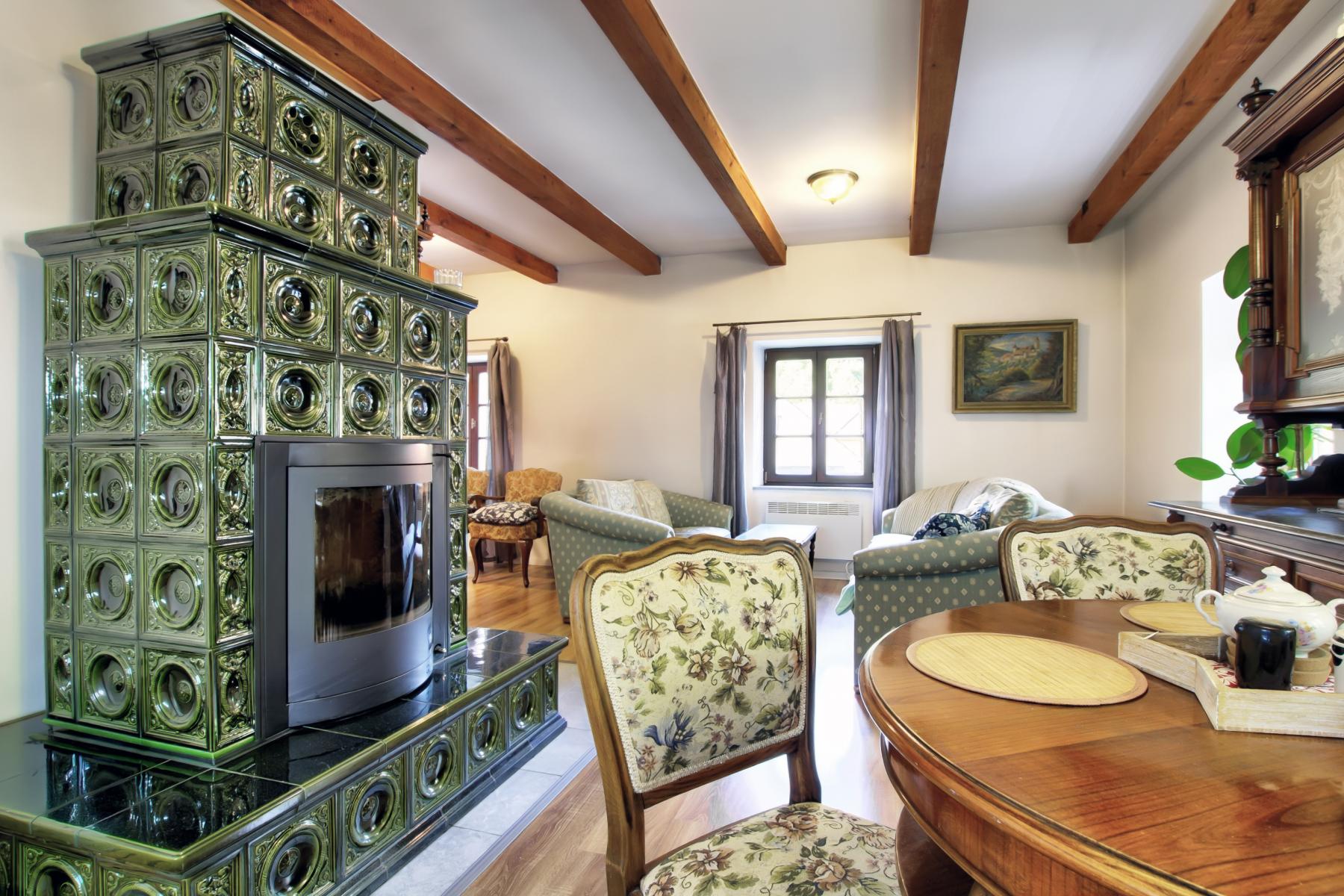 Dům na třech podlažích nabízí útulný interiér s důrazem na detaily, dřevěné podlahy, kvalitní keramiku a prvky zachovávající dobový charakter.