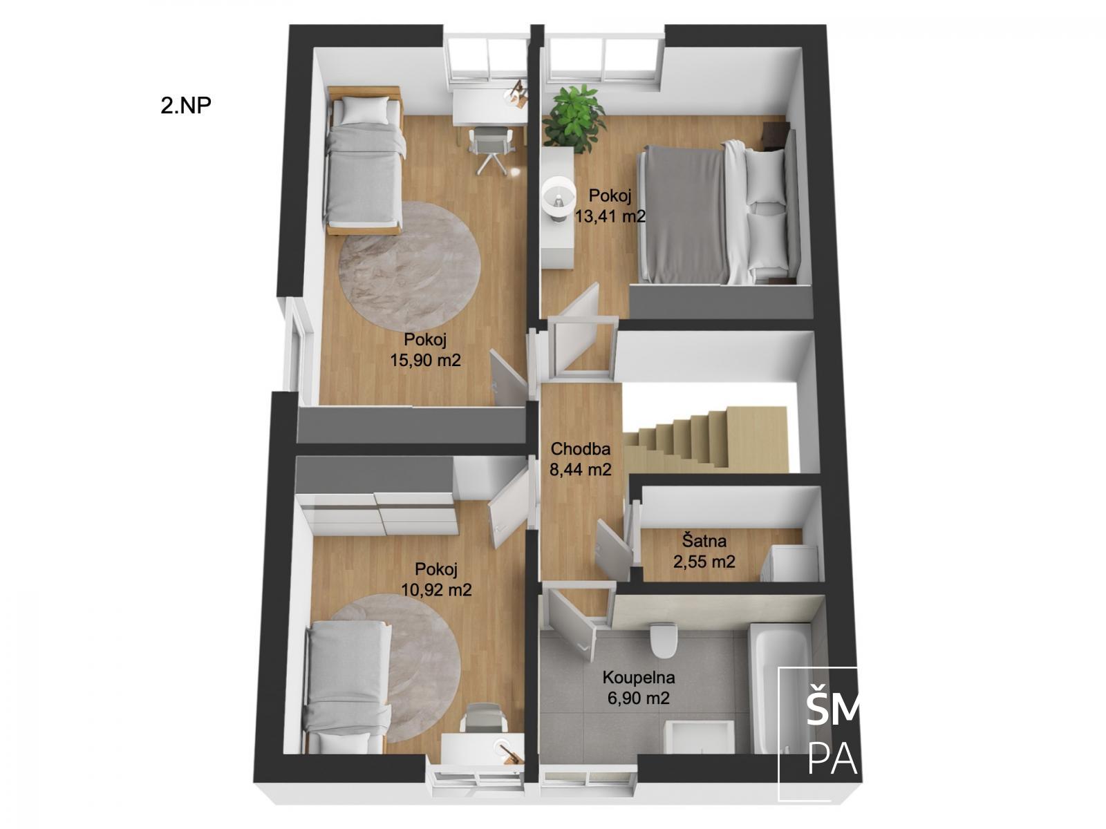 Ve 2NP se nachází tři ložnice, druhá koupelna vybavená vanou a technické zázemí pro pračku, sušičku a další nezbytné domácí náčiní.