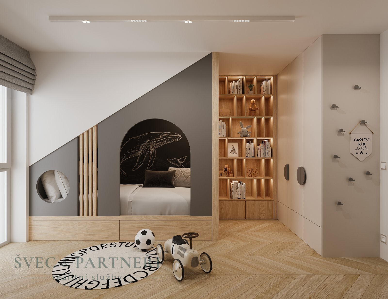 V patře vás čeká klidová zóna s prostornou ložnicí, dvěma dalšími pokoji, koupelnou s vanou a praktickou chodbou, která propojuje jednotlivé místnosti. Každý člen rodiny si zde najde svůj koutek a současně zůstáváte stále propojeni.