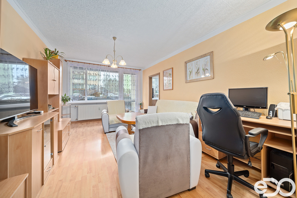 Jedná se o prostorný byt o dispozici 3 + 1 s lodžií, o podlahové ploše 75,4m². Ideální pro rodiny s dětmi, a pro osoby se sníženou možností pohybu, i vzhledem k jeho umístění v prvním nadzemním patře.