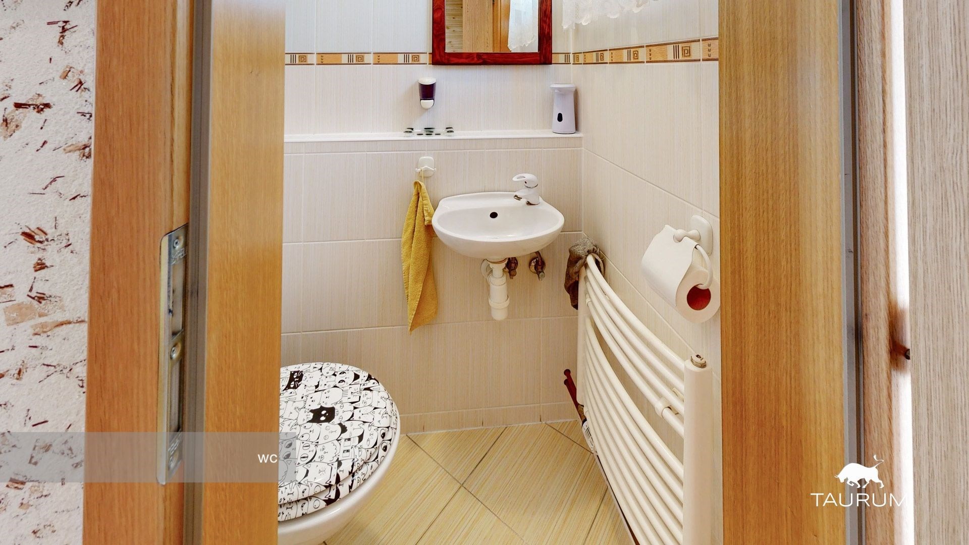 Zde se po levé straně nachází prostorná koupelna s vanou, dvěma umyvadly a bidetem, dále pak ložnice a další dva pokoje. Po pravé straně je pak spojovací místnost mezi obývacím pokojem a kuchyní, s jídelním koutem a s dalším vstupem do chodbičky, kde je k dispozici úklidová komora, samostatné WC a pak vstup na balkon lemující dům a další a poslední vstup do podkroví.