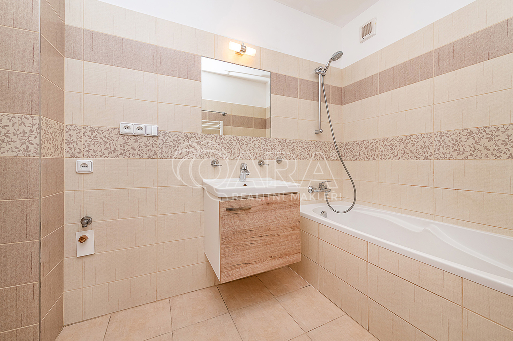 Byt je po rekonstrukci se zděným jádrem a praktickou prostornou šatnou/komorou přístupnou z předsíně. Byt je vybaven kuchyňskou linkou s plynovou varnou deskou a troubou, digestoř je odvětrávaná do šachty. Lednici je možné schovat do linky či zvolit volně stojící (ledničkou není byt vybaven). Prostorná koupelna s vanou a místem pro pračku, wc oddělené. Vytápění a ohřev vody centrální z vlastní plynové kotelny. Plastová okna. Zasklená lodžie. Na podlahách je dlažba a v obytných místnostech jednotná vinylová podlaha.