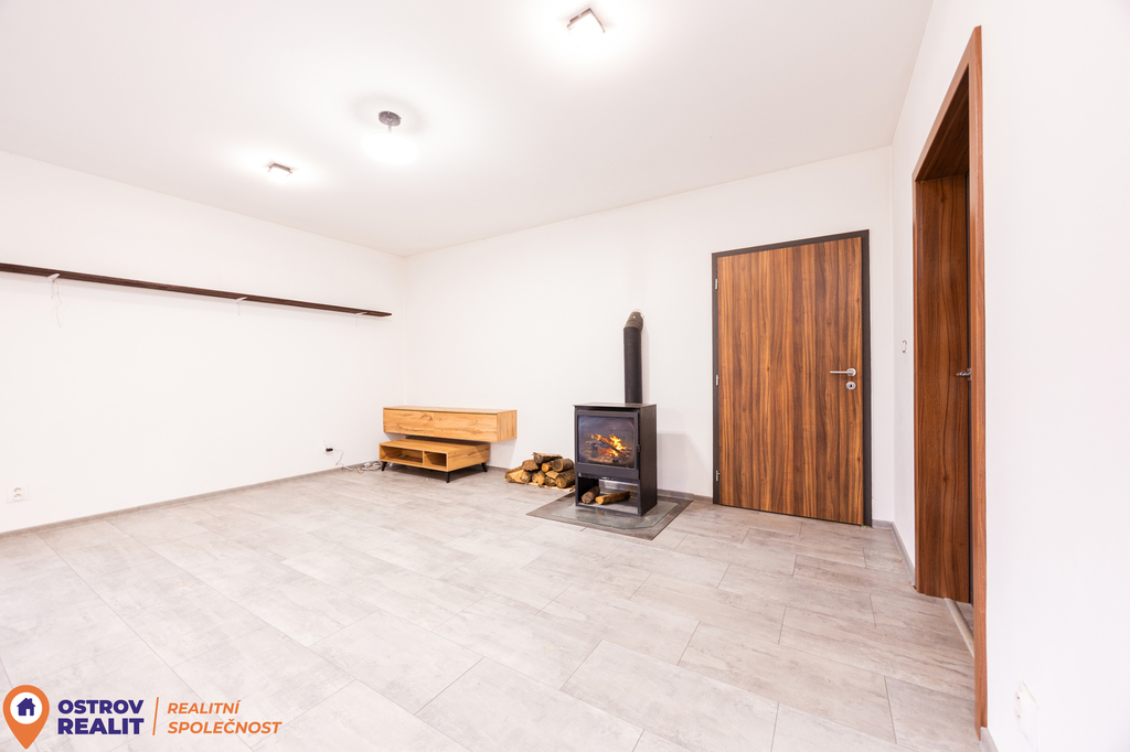 V obývacím prostoru jsou krásná kamna (nejsou součástí prodeje)