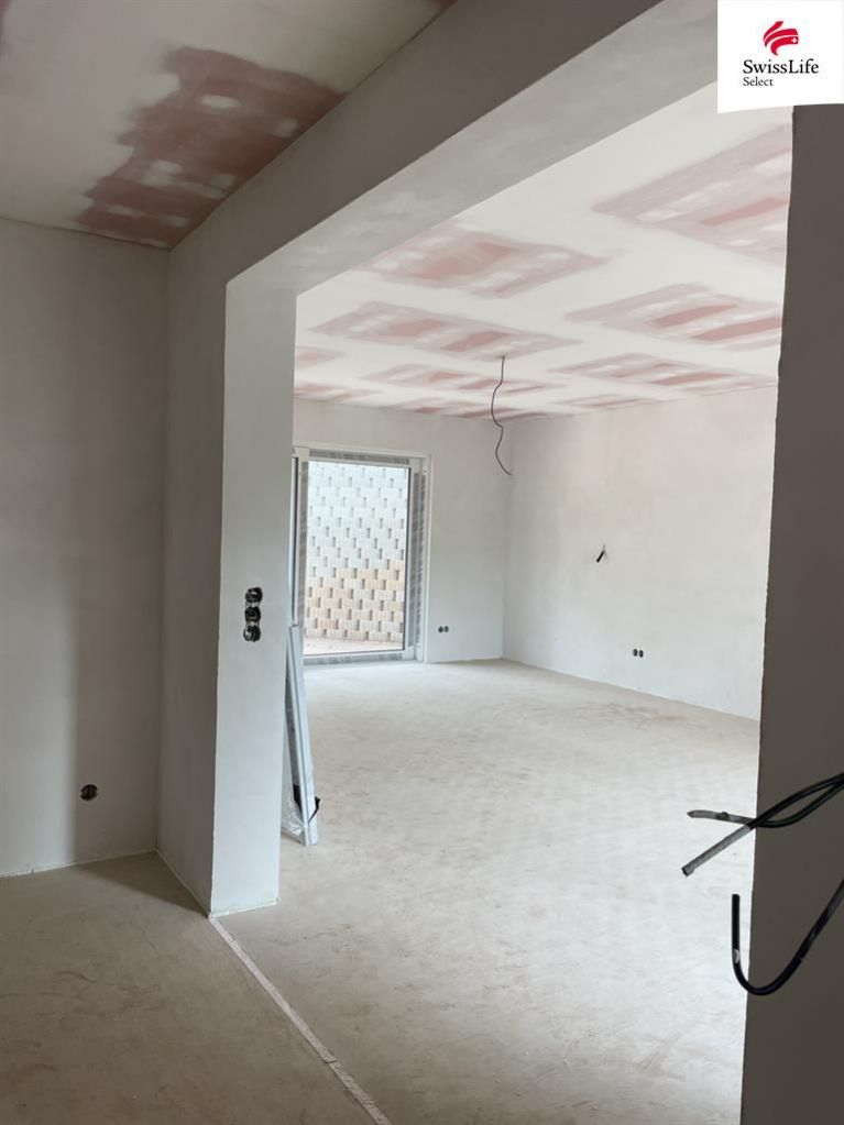 Dispozičně je byt v patře, dominantou obytného prostoru s kuchyní jsou dvě velkoformátová okna se vstupem na terasu a do zahrady. Tento celoprosklený vstup vás zavede z jedné strany na terasu, z druhé strany do míst, kde může být velký bazén. Tyto posuvné stěny dodávají obývacímu pokoji neskutečnou atmosféru. Můžete sledovat západy slunce i padající vločky a to vše v naprostém soukromí.