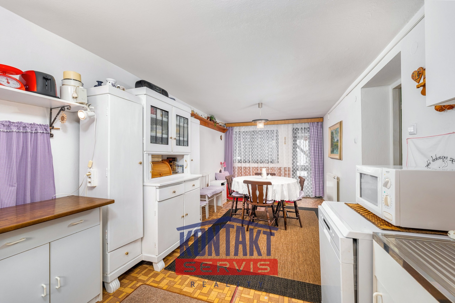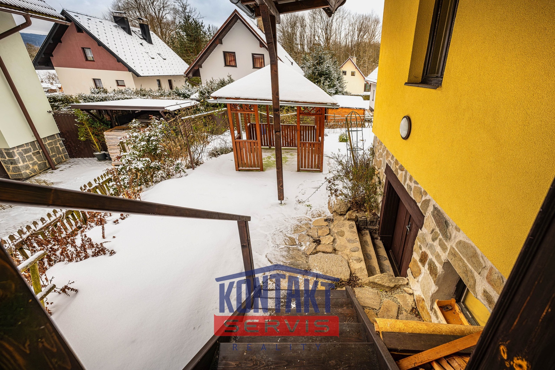 Přízemí – Srdce domu: Vstupte do prostorného obývacího pokoje, kterému dominují krbová kamna. Představte si zimní večery s praskajícím ohněm a sklenkou vína po lyžování. Navazuje plně vybavená kuchyně (myčka, el. trouba, mikrovlnná trouba, stylový příborník) s jídelním koutem, kde se budou rodit ty nejlepší rodinné vzpomínky. Samozřejmostí je koupelna se sprchovým boxem.