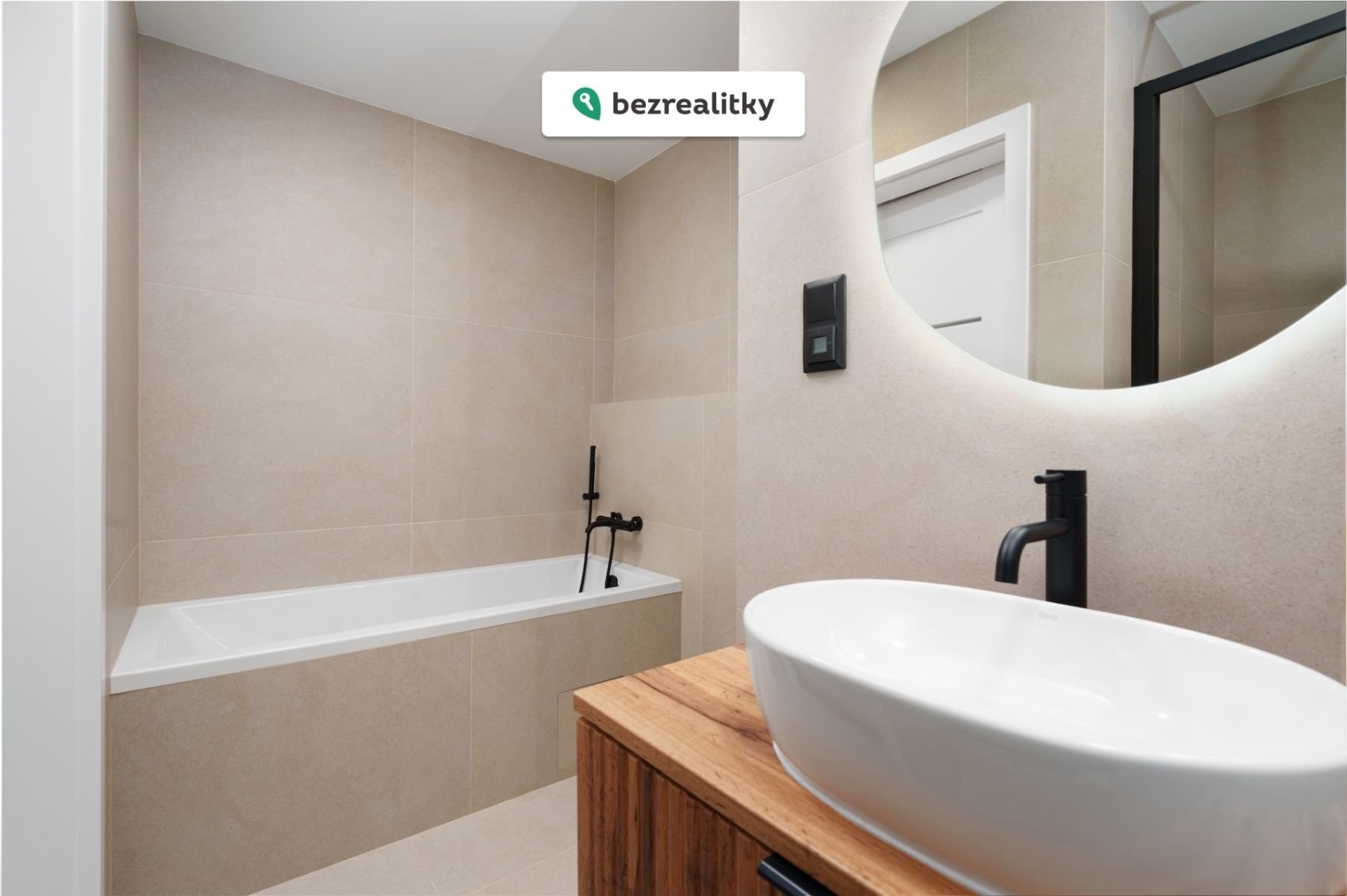 Koupelna je navržena pro nejnáročnější uživatele – nachází se zde WC, vana i sprchový kout s designovými podomítkovými bateriemi, podlahové topení s termostatem a precizně zpracované kamenické detaily.