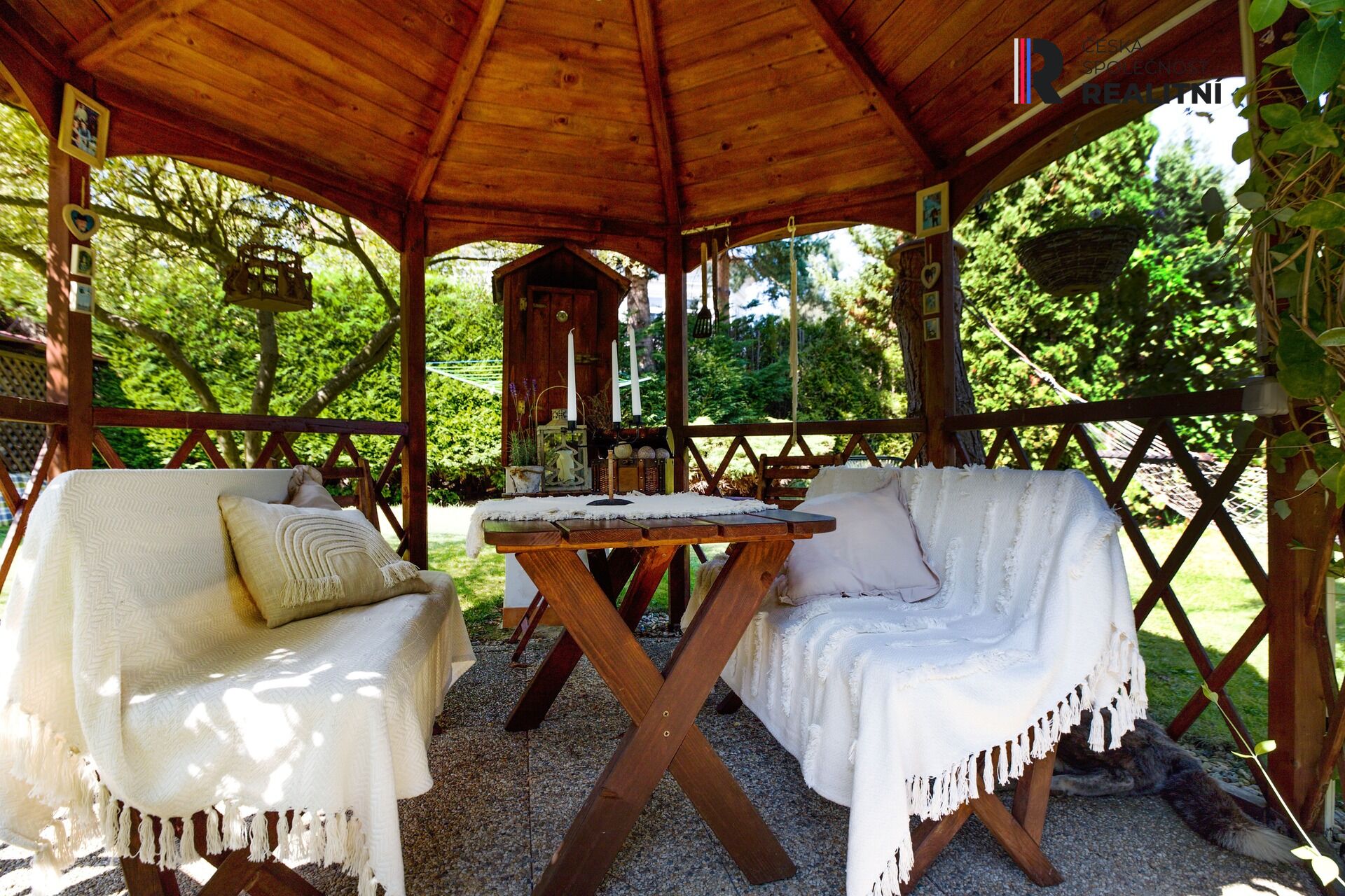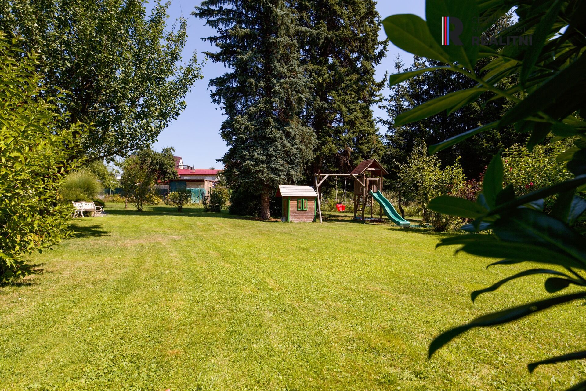 Tato velkorysá zahrada je ideálním místem pro odpočinek, posezení u grilu s rodinou a přáteli nebo pro pěstování vlastní zeleniny a květin. Prostor tu má také dětské hřiště, je zde zastřešený bazén, houpačka, altánek, ohniště, udírna, skleník aj.