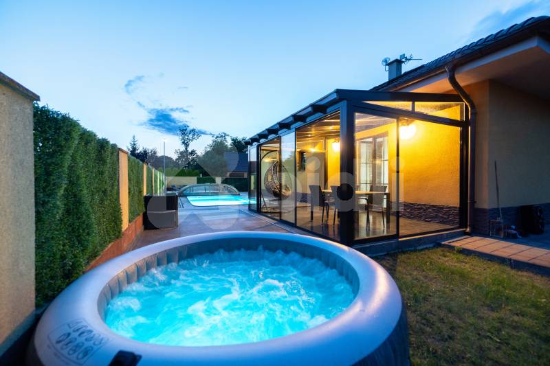 Součástí domu je zahrada s vlastní kopanou studnou. Pro nadstandardní bydlení využijete bazén se slanou vodou o objemu 20 m3. Prostorné velké dětské hřiště, vířivku, pergolu o velikosti 20 m2 a ohniště pro venkovní posezení.