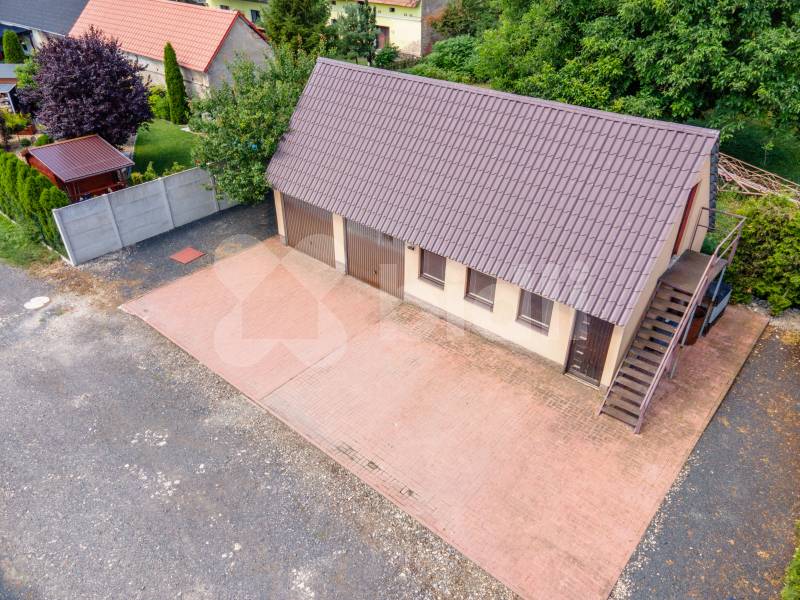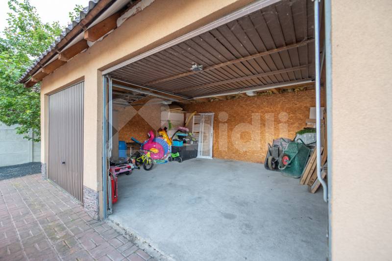 Naproti domu se nachází zateplená garáž, které zajišťuje parkování vozidel jak před, tak i v garáži. Garáž má i svou místnost, dílnu a využitelné podkroví.