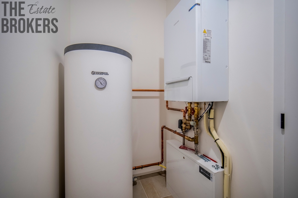Nemovitost je napojena na obecní vodovod, odpad je řešen betonovou jímkou (6 m³). Dešťová voda je sváděna do akumulační nádrže o objemu 5 m³ s následným vsakem na pozemku. Velkým benefitem je také chytrá domácnost, která umožňuje vzdálené nebo centrální ovládání vytápění, osvětlení i zabezpečení domu.