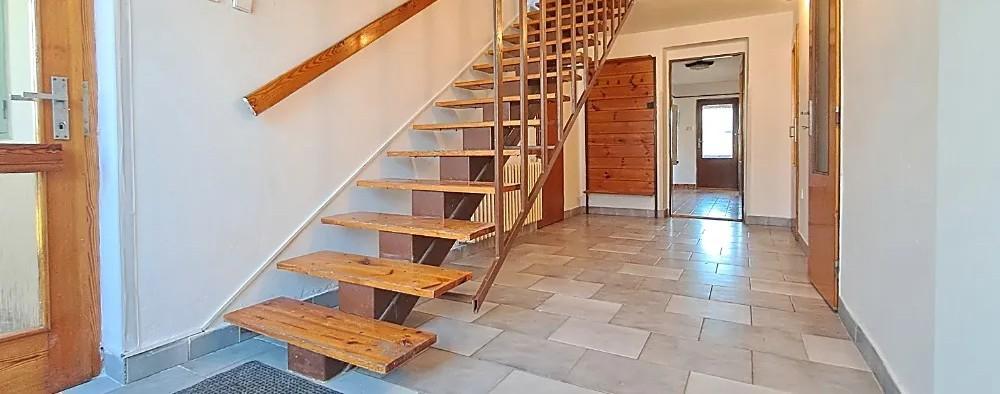 1.NP - ze zádveří je vstup do haly, odkud vede schodiště do 2.NP a vstup do garáže, z chodby je vstup dále do kumbálu, technické místnosti s eko-kotlem, do skladu, odkud je vstup do sklípku, kde se nachází studna, dále do pracovny a zadními dveřmi se vstupuje do zahrady. Napravo je vstup na WC a do koupelny, do komory a z chodby je vstup do pokoje s kuchyňkou.