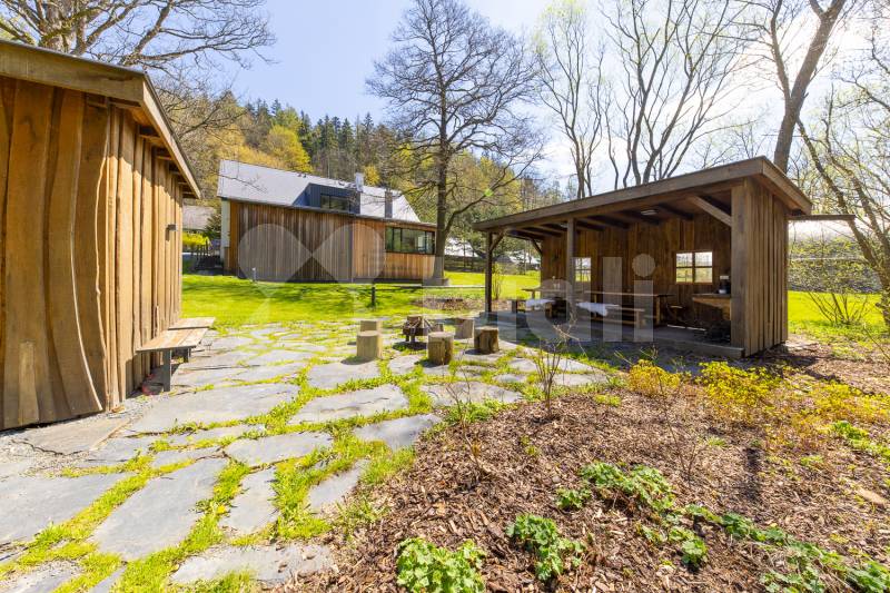 U vchodu vlastní prostorné parkoviště a sklad zahradní techniky. V zázemí za domem je zastřešená terasa s posezením, ohništěm, elektřinou a vodovodem, finská sauna, venkovní sprcha, volejbalové a dětské hřiště. Vše vybaveno osvětlením. Všude kolem je vlastní prostorný zatravněný pozemek. Jeho zadní hranici lemuje Bělokamenný potok, průzračná bystřina pro osvěžení i zábavu.