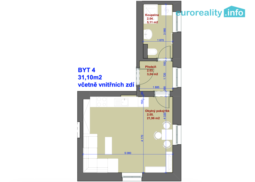 | Dispozice/podlahová plocha: | 1+kk/31 m² |