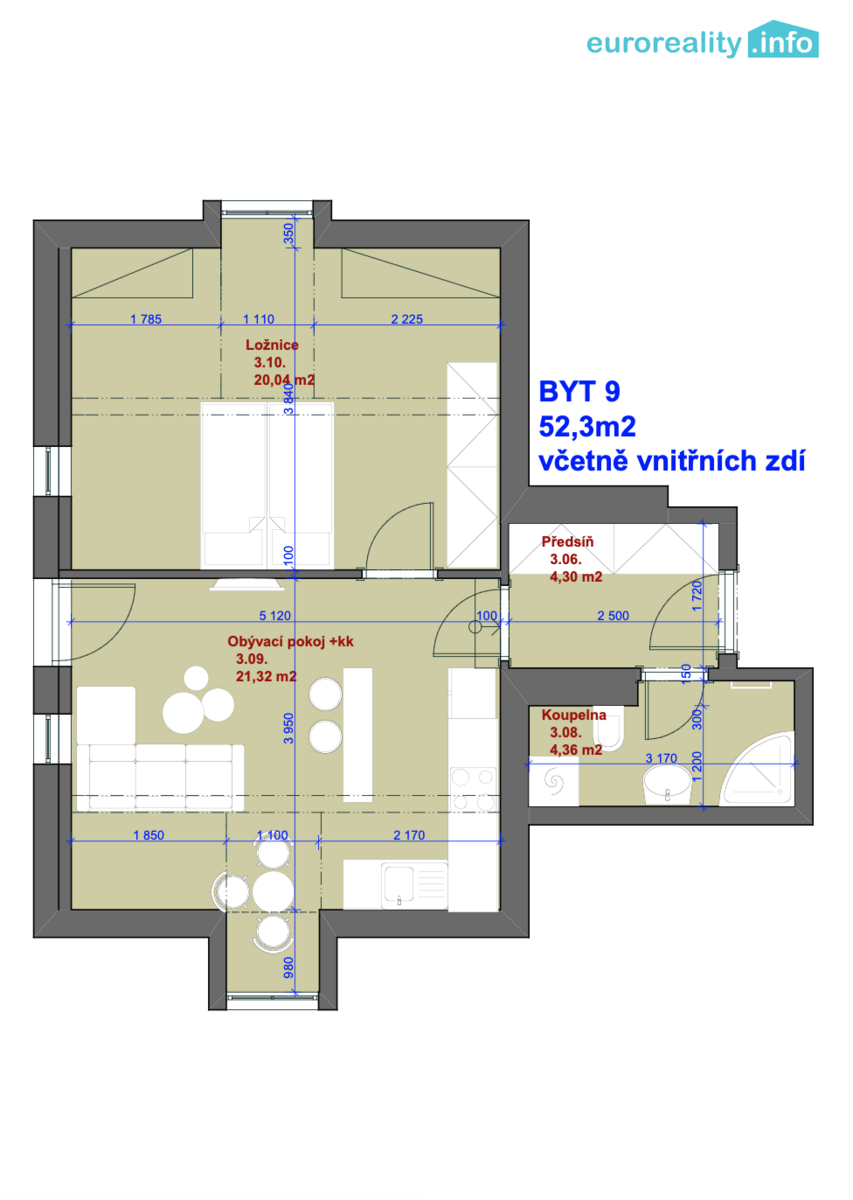 | Dispozice/podlahová plocha: | 2+kk/52 m² |
