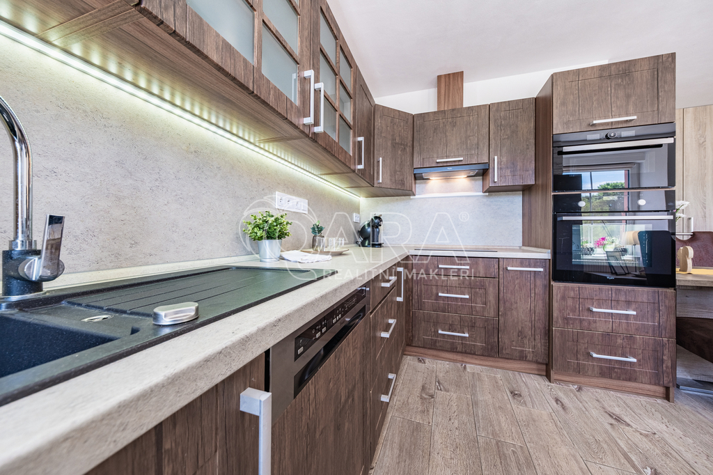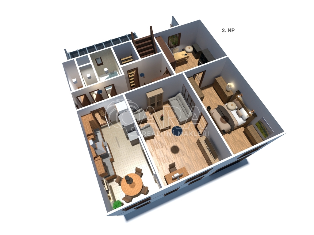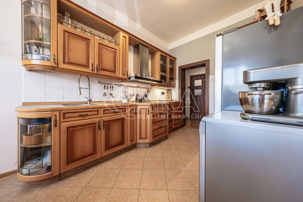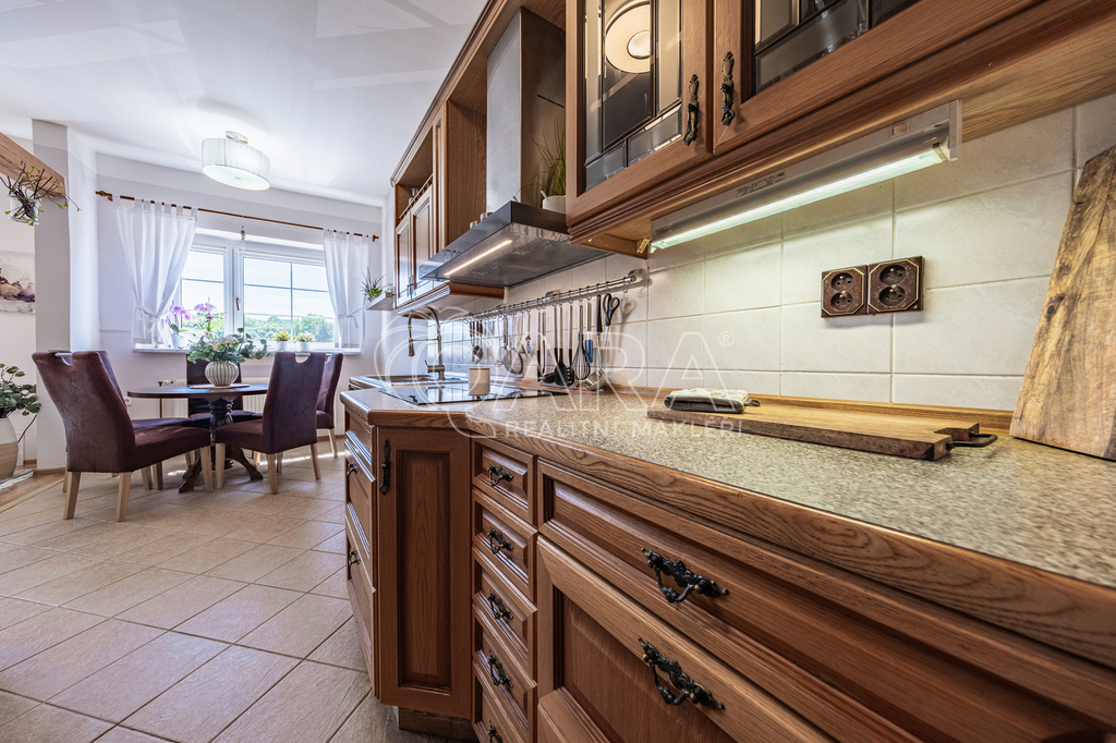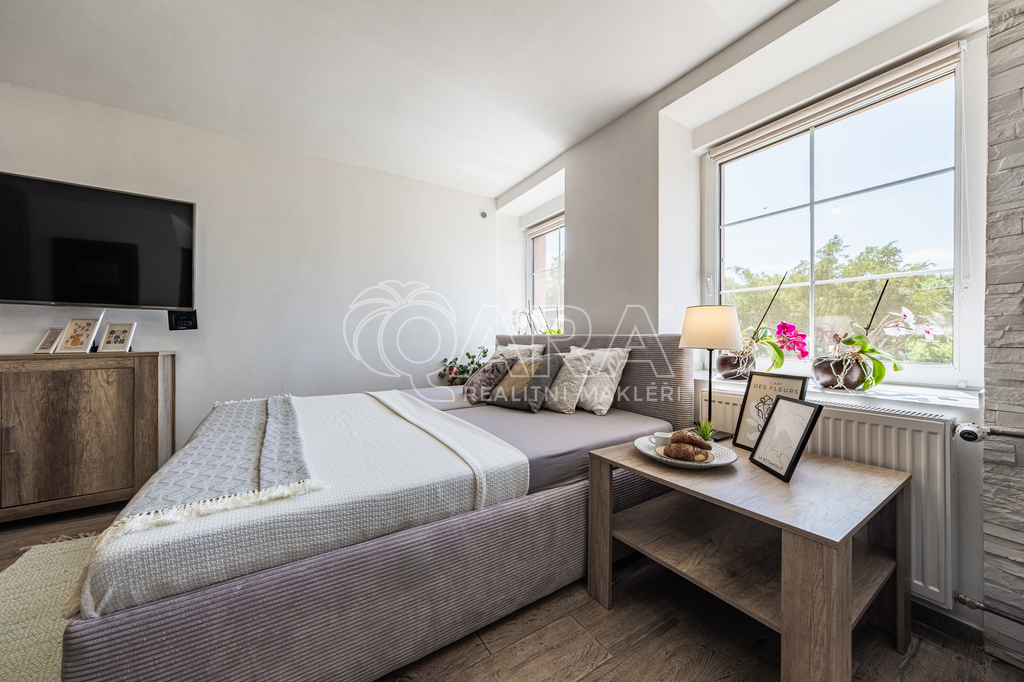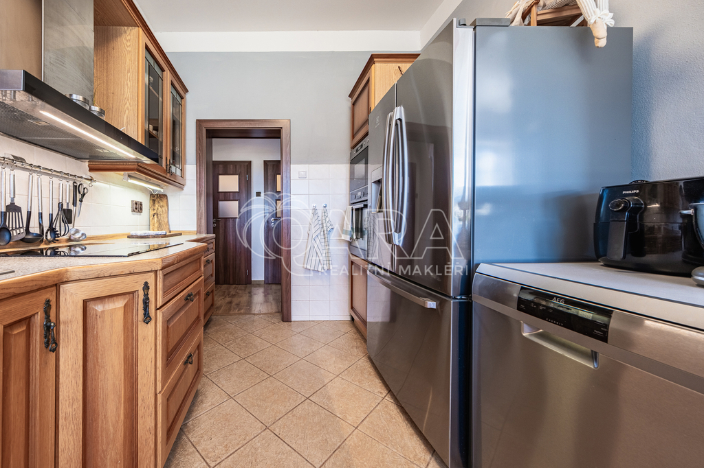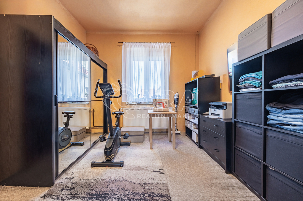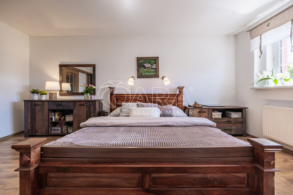 Dominantou horního podlaží je prostorný a světlý obývací pokoj decentně sladěný a propojený s kuchyní, také plně funkční, jídelním koutem a pracovním prostorem. Na obývací pokoj navazuje útulná vybavená ložnice, a další ložnice, která je nyní využívána jako šatna, tělocvična a pracovna paní domu.