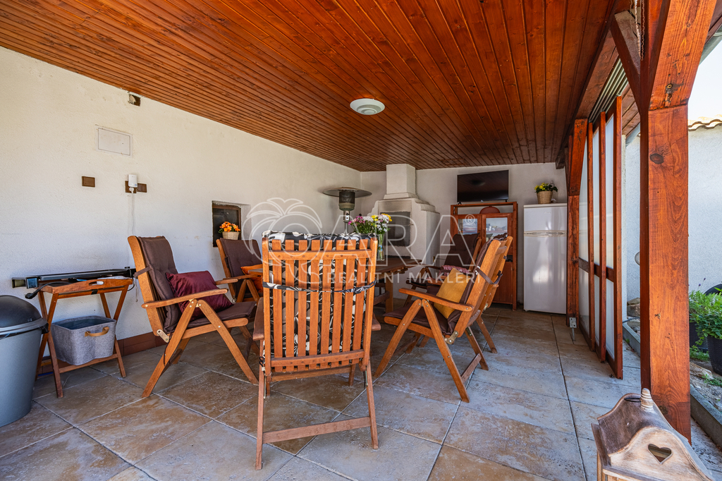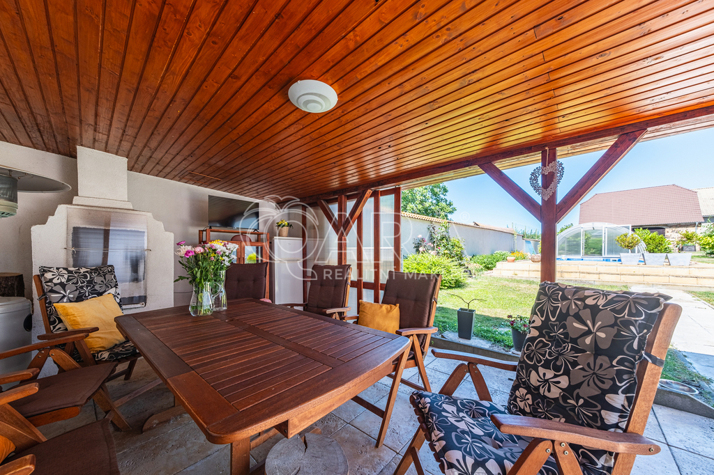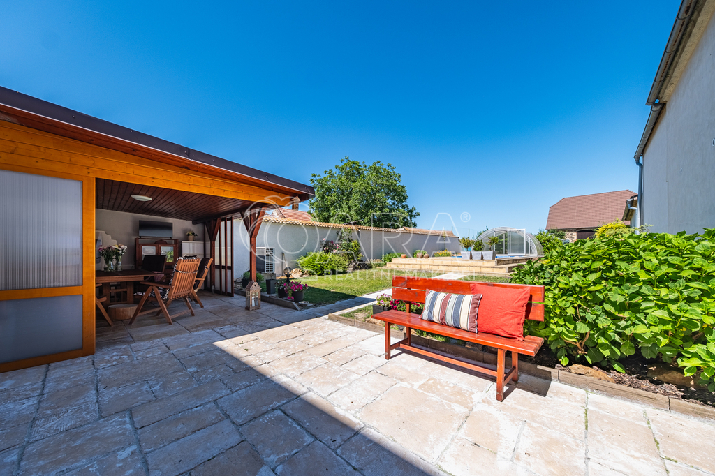 Z nejvyššího patro se sneseme opět do přízemí přímo na udržovanou zahradu se skleníkem, se zastřešeným bazénem se slanou vodou, bazén není vyhřívaný, ale i tak je možno se koupat i v podzimních slunečních dnech. Venkovní posezení si můžete vychutnat pod zastřešenou pergolou s krbem. Stodola na druhém konci zahrady nabízí další prostor pro dílnu či garáž. Technické zázemí a malý sklad s dílnou se nachází v samostatných místnostech hned vedle domu.