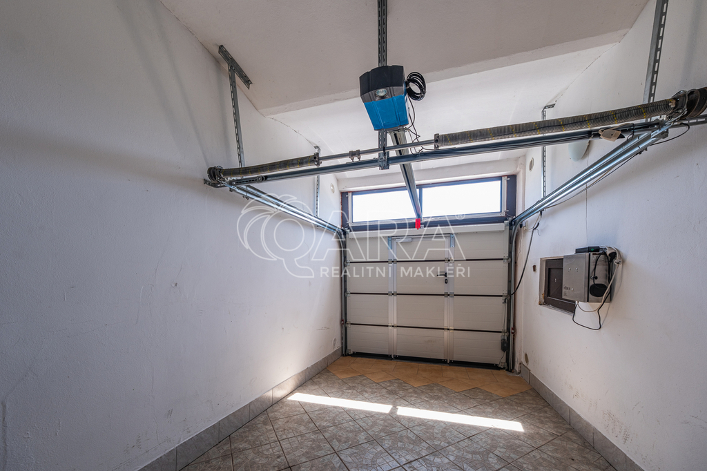 Do domu se vchází bývalým průjezdem, ze kterého je nyní uděláno prostorné garážové stání, takže pěkně suchou nožkou z domu do auta. Vjezd je opatřen novými elektrickými garážovými vraty se samostatným vstupem "pro pěší". Je zde umístěný Wallbox - nabíjecí stanice pro dvě elektroauta. Z průjezdu se vchází do přízemí domu nebo rovnou na zahradu. V přízemí je situován samostatný byt 1+kk, který je možno využít jako kancelář či máte-li odrostlejšího potomka a chce se cítit tak trochu samostatně, i zde je tato možnost, nebo pronájem. Byt je vybaven plně funkční kuchyňskou linkou, velkou a pohodlnou manželskou postelí s nočními stolky, komodou a TV, jídelním stolem a velkorysou šatní skříní na míru, prostornou koupelnou se sprchovým koutem a toaletou.