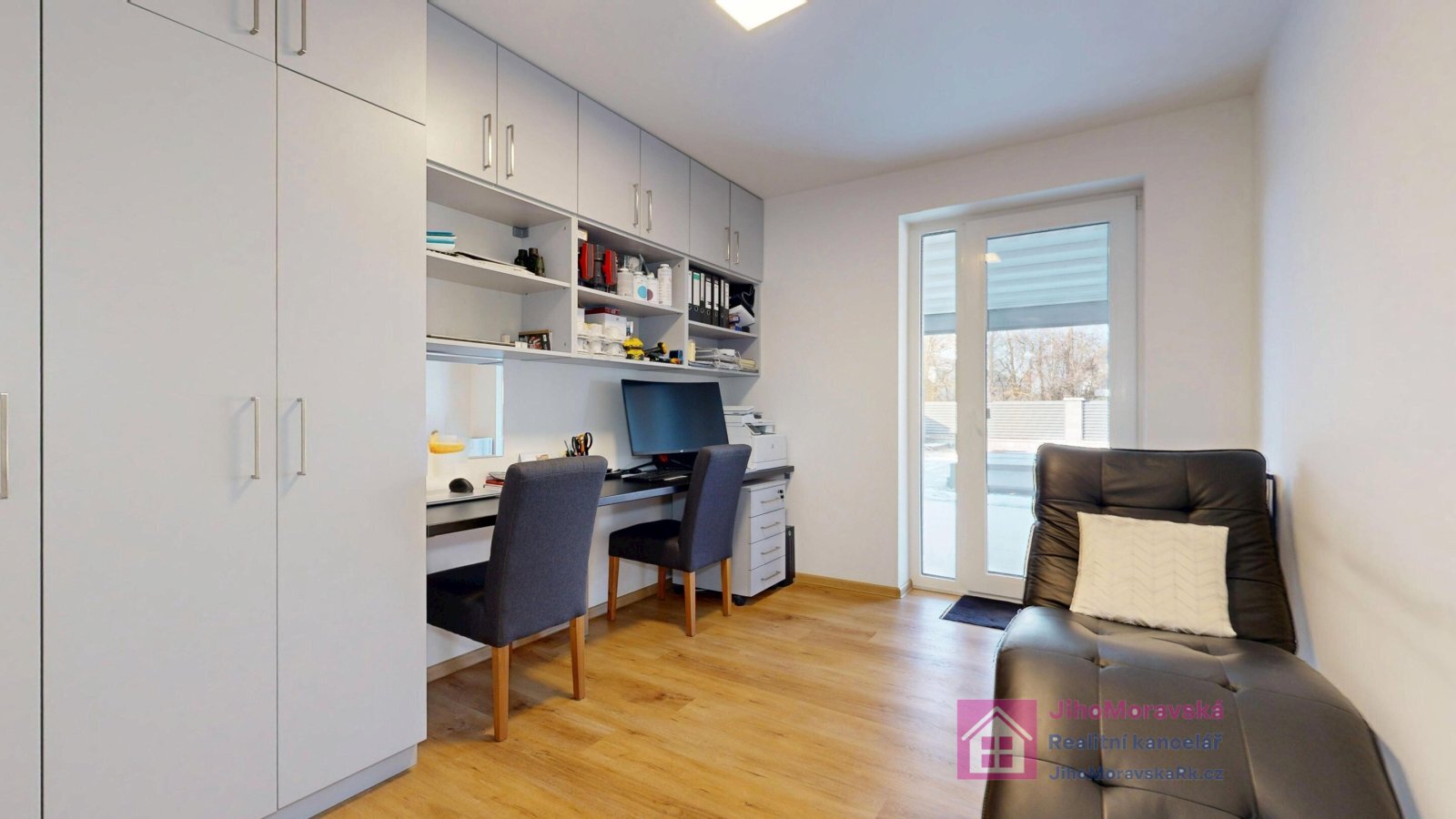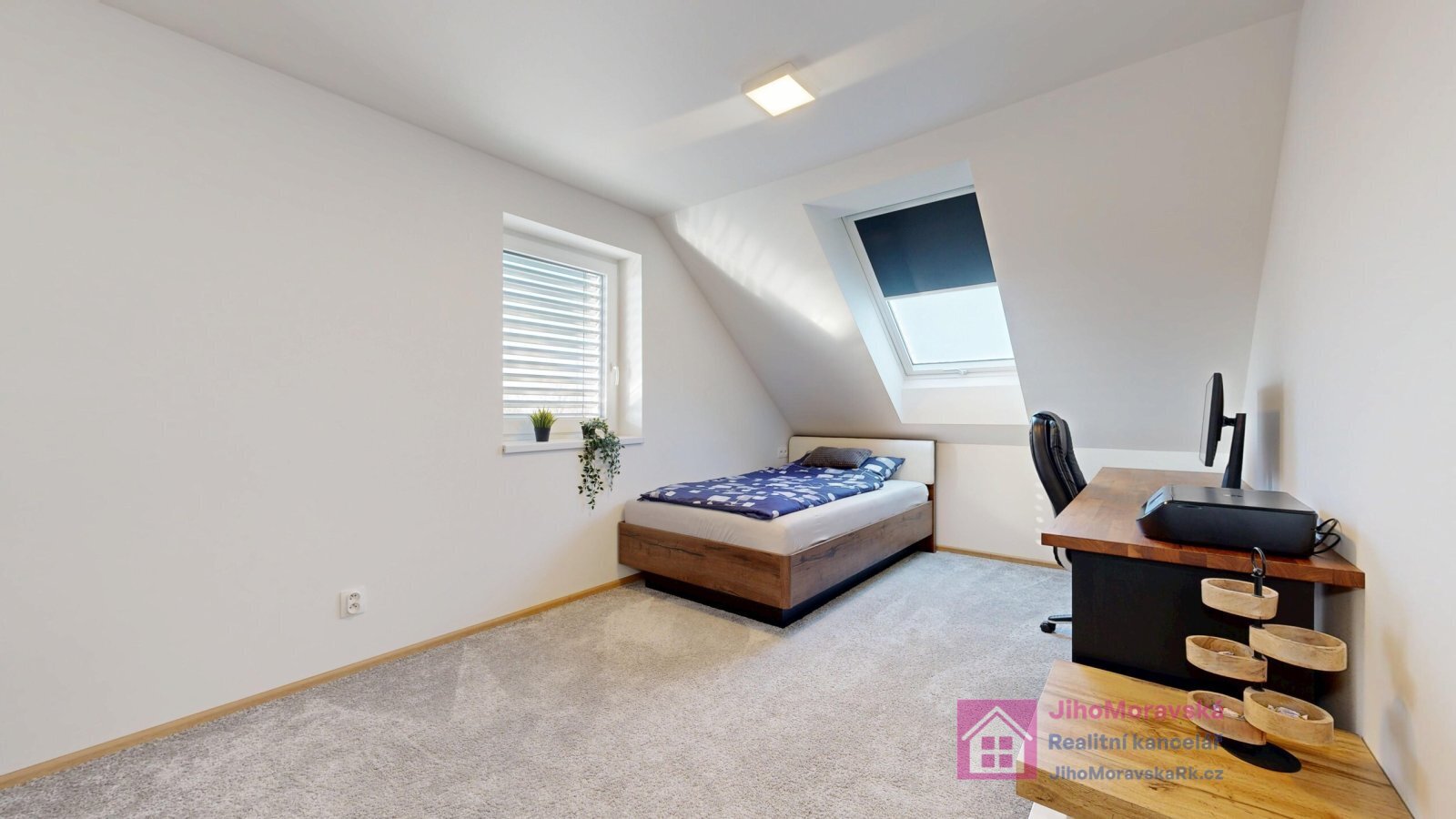 2. nadzemní podlaží: chodba, technická místnost s pračkou a sušičkou tři samostatné pokoje a koupelna (vana) s WC. Přímý vstup z terasy do pracovny a obývacího pokoje.