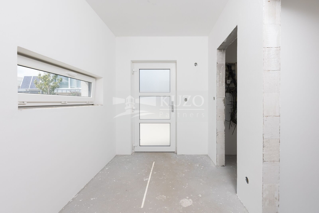 V přízemí přes vstupní předsíň se nachází prostorný obývací pokoj s kuchyňským koutem o výměře skvělých 38 m2, dále koupelna se sprchovým koutem a toaletou, technická místnost a prostorná garáž o výměře něco málo přes 28 m².