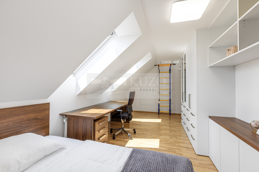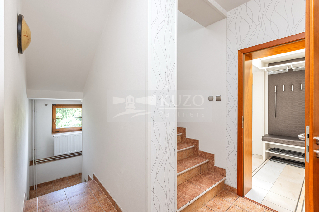 Na prostorný obývací pokoj s kuchyňským koutem plynule navazuje vytápěná zimní zahrada, která nabízí ideální prostor pro odpočinek během celého roku – ať už si užíváte ranní kávu, nebo večerní posezení s výhledem do zahrady.
