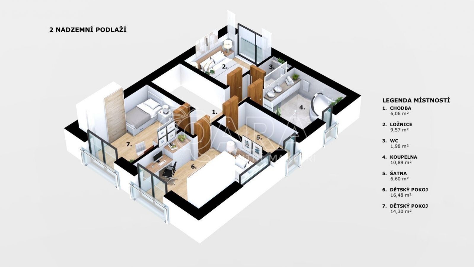 * Horní patro: ložnice, dva dětské pokoje, šatna, koupelna a samostatné WC.