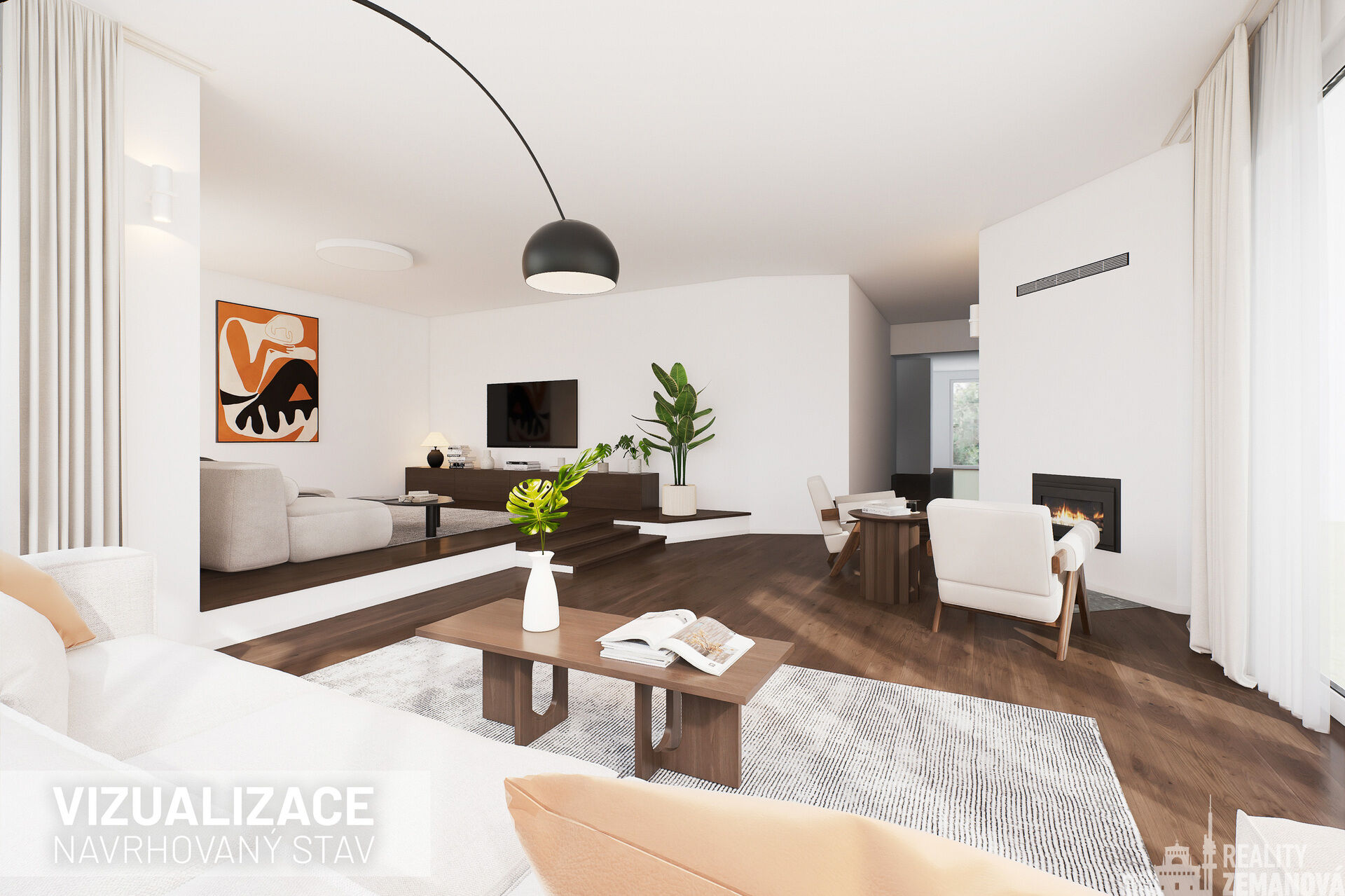 Dominantou přízemí je velkorysý obývací pokoj s krbem o rozloze 51,3 m², který nabízí prostor pro kulečník, domácí kino nebo relaxační zónu. V případě potřeby lze pokoj rozdělit příčkou a vytvořit další samostatnou místnost.
