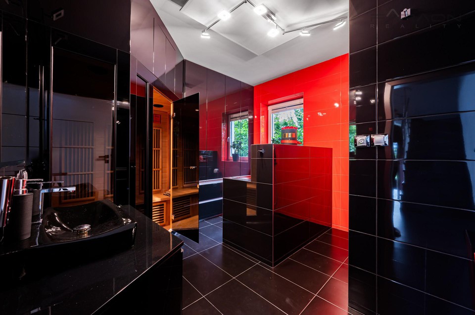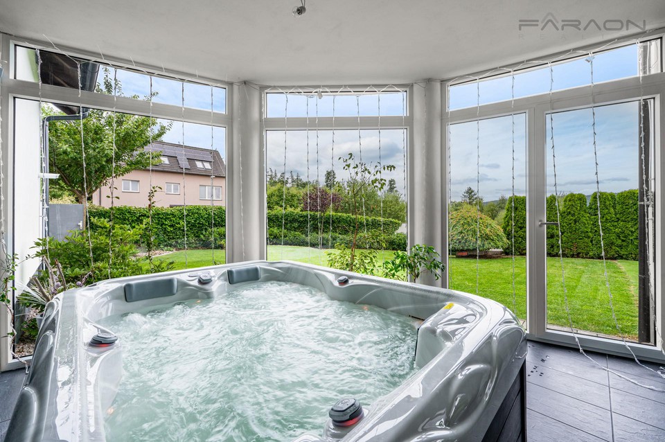 Vytápění domu zajišťuje moderní tepelné čerpadlo a plynový kotel s podlahovým vytápěním v přízemí. Okna jsou plastová s hliníkovými rámy a elektrickými žaluziemi. Vila nabízí tři prostorné vestavěné šatny a dvě koupelny vybavené luxusními prvky, včetně sauny, hydromasážní vany a vyhřívací lavice ve sprše. Exteriér doplňuje zastřešený a vyhřívaný bazén a dětský domek o velikosti cca 25 m². Dům je napojen na městský vodovod a kanalizaci.