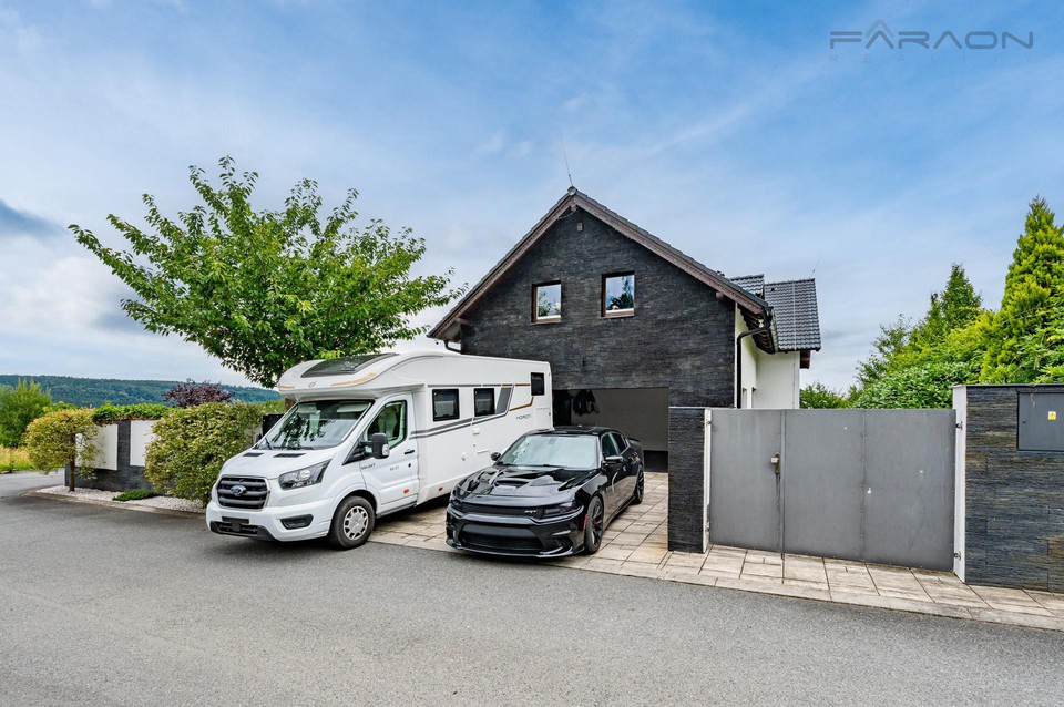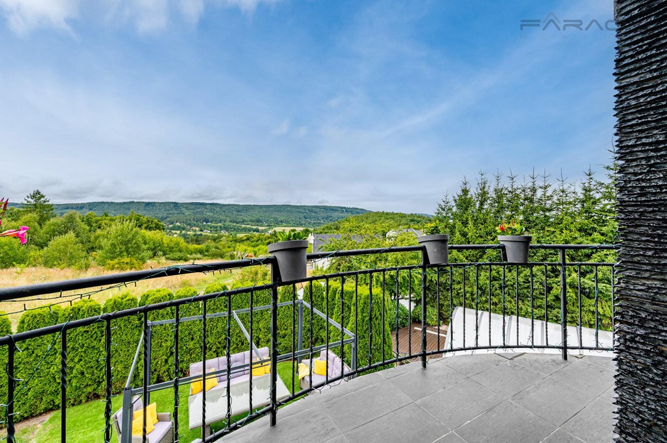 Vila zahrnuje dvě nadzemní podlaží a půdní prostor a nabízí sedm pokojů s kuchyní plus pracovnu. K dispozici jsou prostorné terasy a balkón poskytující příjemné venkovní posezení s krásným výhledem. Součástí nemovitosti je garáž a další parkovací místa na pozemku.