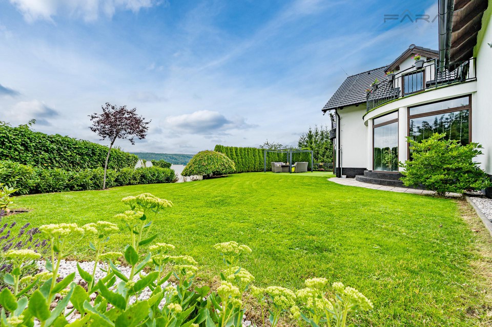 Nemovitost je vkomponována do přírodní scenérie tak, aby byla zachována intimita a komfort. Součástí pozemku je vyhřívaný bazén o rozměrech 6 × 3 metry a samostatný dětský domek, který lze využít také jako letní kuchyň nebo domek pro hosty. Z pozemku je přímý vstup do přilehlého lesa, což umocňuje spojení s okolní přírodou.